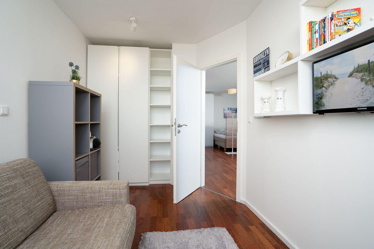 - ein separates kleines zweites Zimmer mit Schlafsofa (Bettfunktion mit vollwertiger Matratze) für 2 Personen (150 cm x 200 cm), 1x TV (32cm)