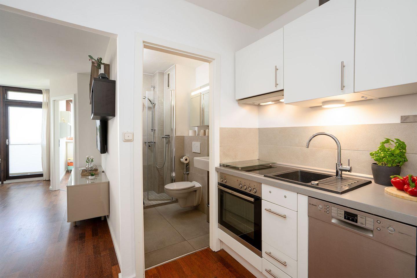 - eine Einbauküche mit Geschirrspüler, Herd, Backofen und Kühlschrank.