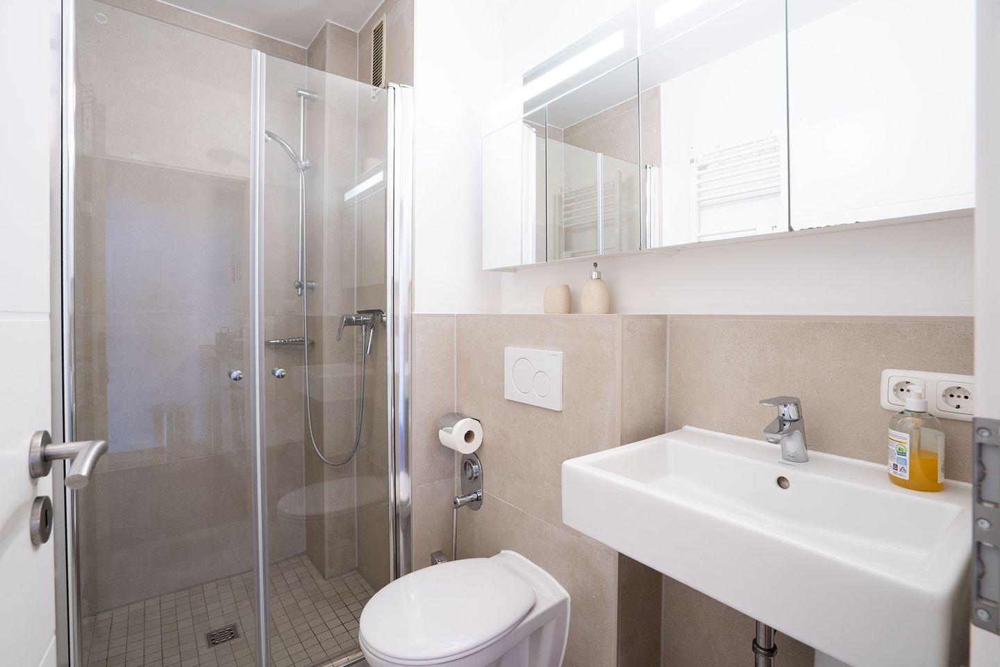 - ein modernes Duschbad/WC mit Waschtisch, wandhängender Toilette, Handtuchheizkörper und Duschkabine.