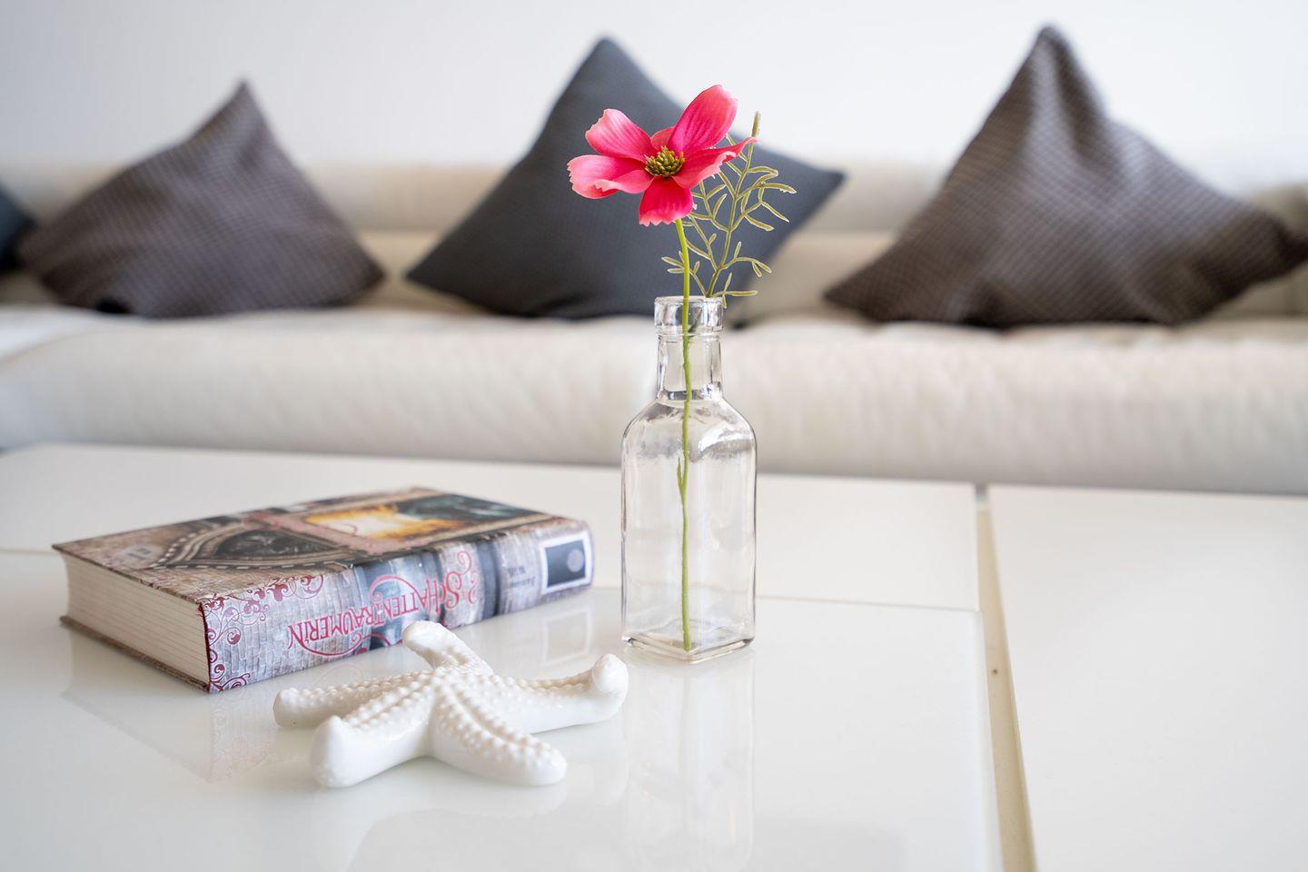 - einen großen Wohnraum mit Meerblick, heller Leder Eckcouch, Couchtisch, 2 x TV (123 cm und 80 cm), Boxspringbett (160 cm x 200 cm durchgehende Liegefläche) für zwei Personen, einen großen Esstisch,