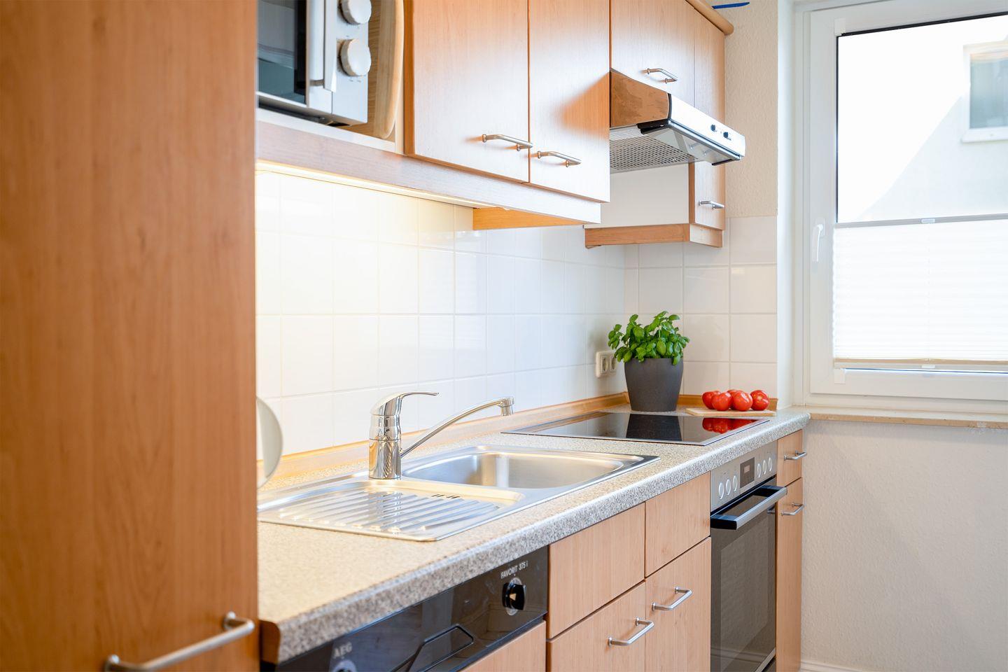 Das ca. 54 m² große 2-Zimmer-Komfort-Appartement befindet sich im 1. OG mit herrlichem Sonnenbalkon und ist komplett mit hellem Laminat ausgelegt. Es ist mit einer Diele, einem hellen Wohn-/Essraum mit Schlaf-Ledersofa, Couchtisch, TV und Radio, separater Einbauküche mit Geschirrspüler und Mikrowelle/Grill, separatem Schlafzimmer mit Doppelbett (zwei einzelne 80iger Matratzen) und Kleiderschrank sowie einem Duschbad/WC ausgestattet.