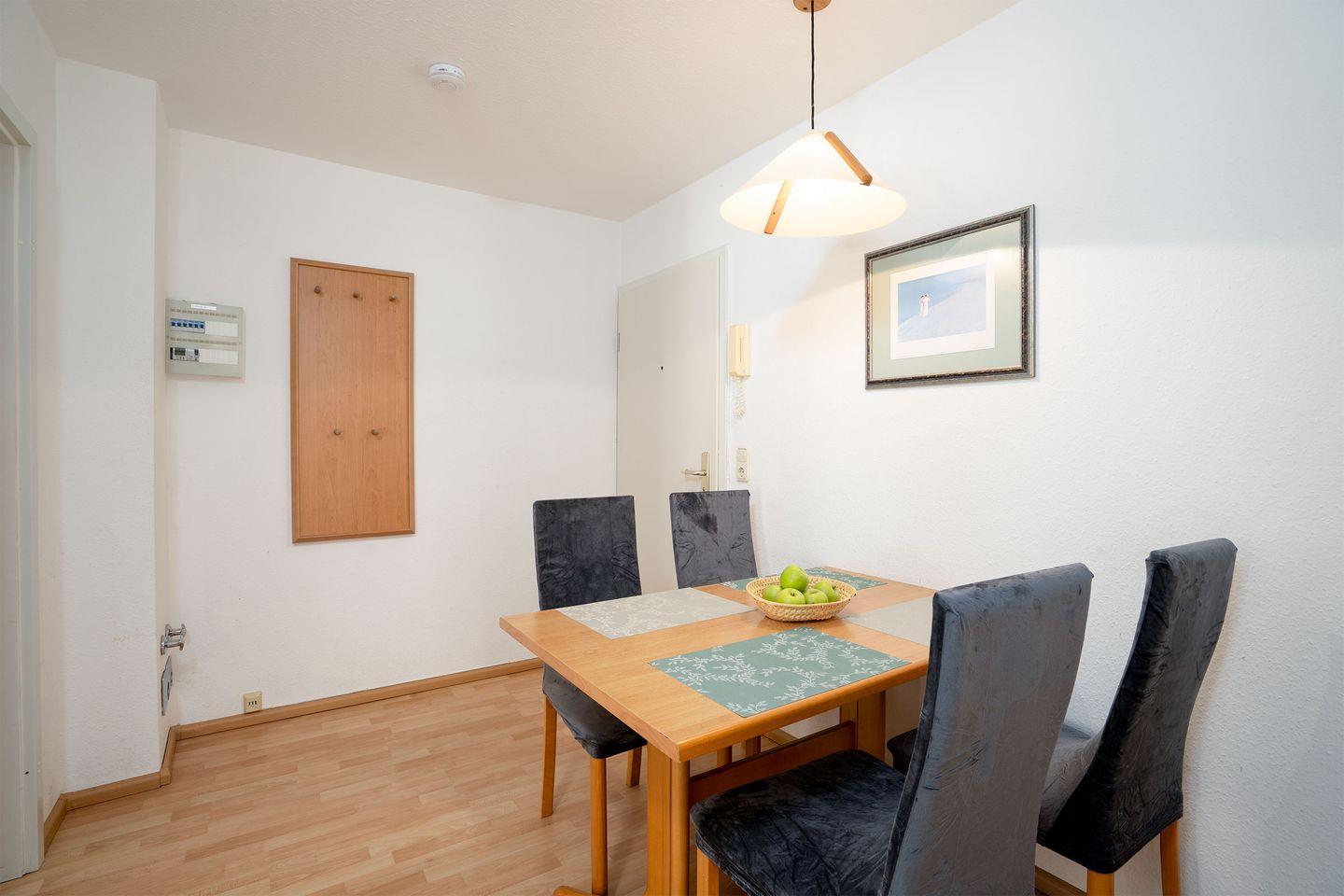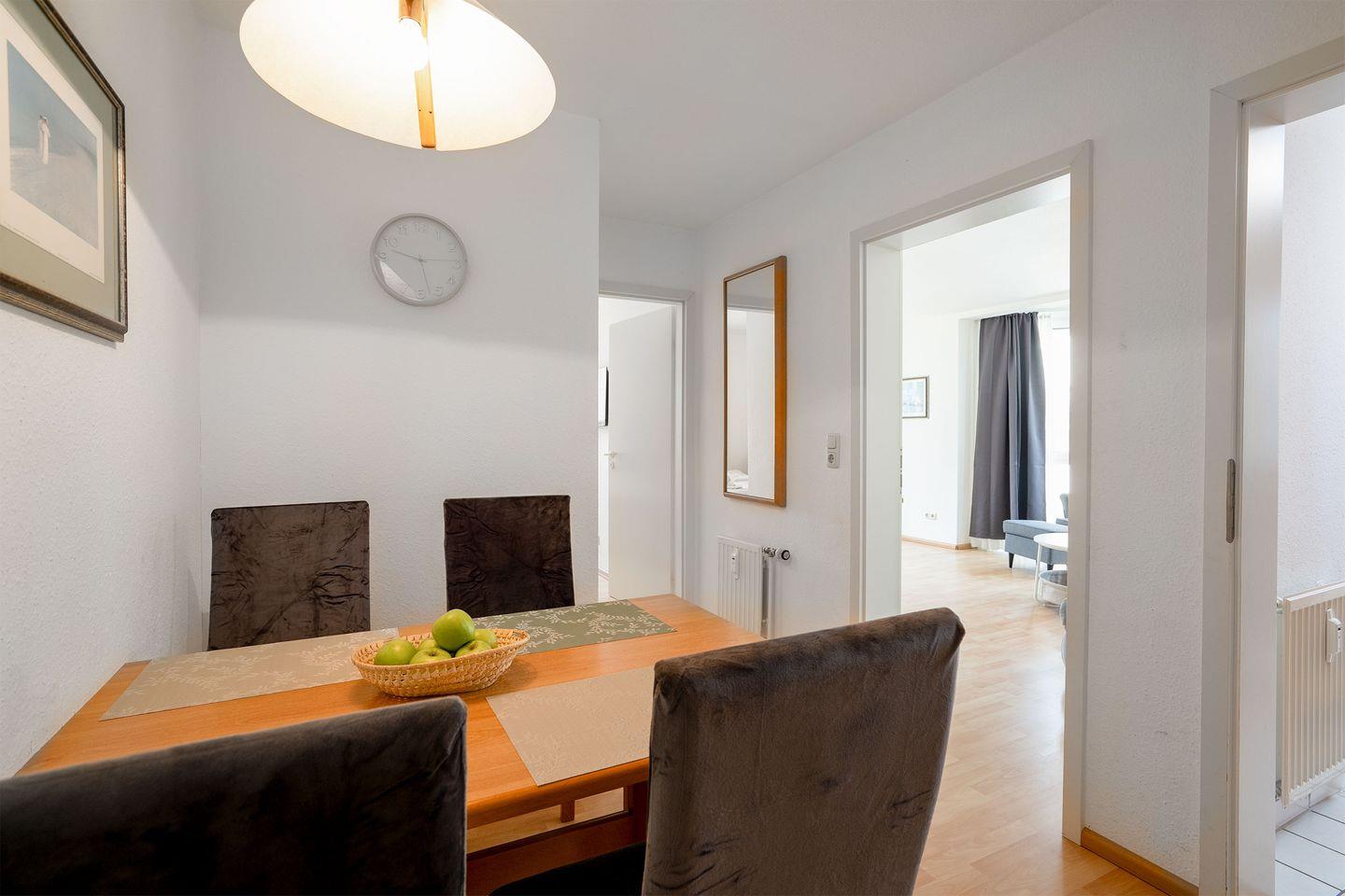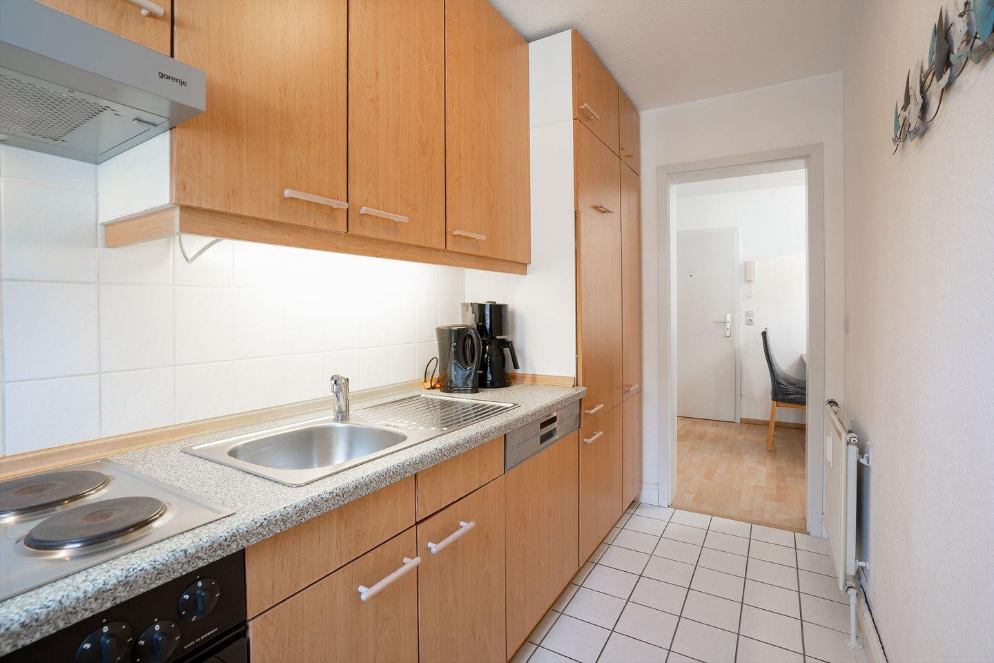 Einfach perfekt für einen schönen Urlaub. Sehr nah am Strand und trotzdem in einer ruhigen Seitenstraße. Das ca. 54 qm große 2-Zimmer-Apartment liegt im 1.OG. Die Wohnung ist mit einem schönen Balkon, einer separaten Küche mit Geschirrspüler, einer Essecke und einem Wohnraum mit Polstergarnitur, welche zur Schlafcouch umwandelbar ist, ausgestattet. Im Schlafzimmer befindet sich ein Boxspringbett (1,80 m x 2 m), ein Kleiderschrank, sowie einem Fernseher. Das Bad hat eine Dusche und WC.