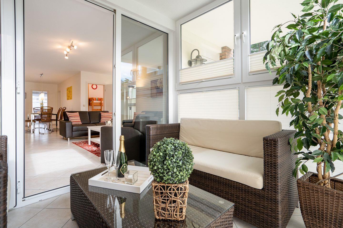 Moderne Ferienwohnung in Scharbeutz mit Terrasse, Wintergarten und nur 100 m zum Strand – ideal für Familien und Erholung.