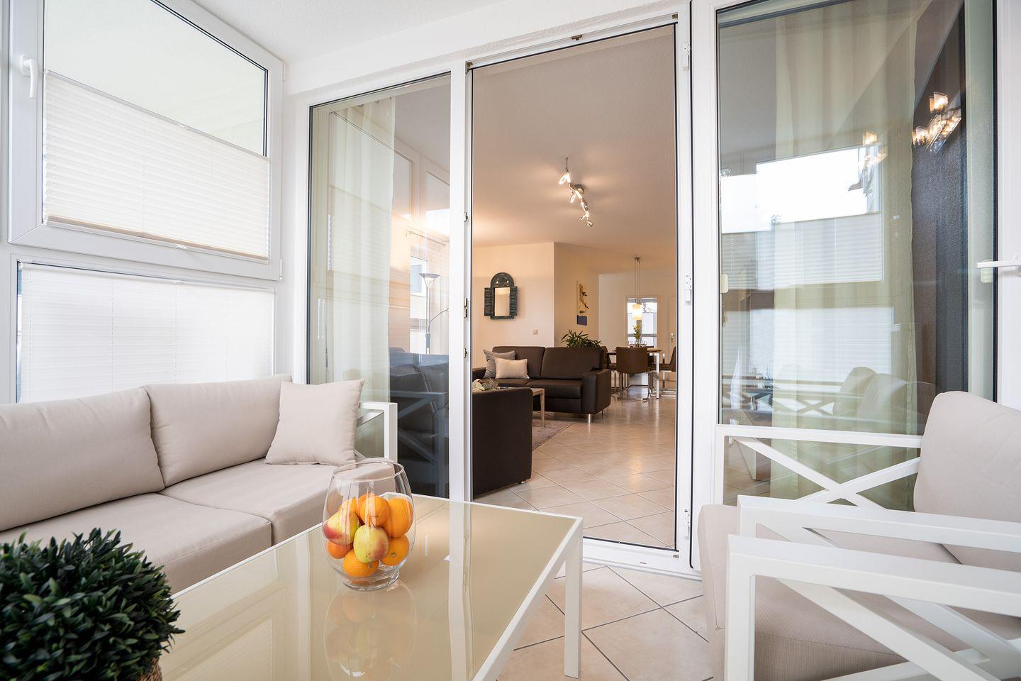 Moderne 3-Raum-Ferienwohnung mit Wintergarten und Balkon nahe Strand und Promenade in Scharbeutz.
