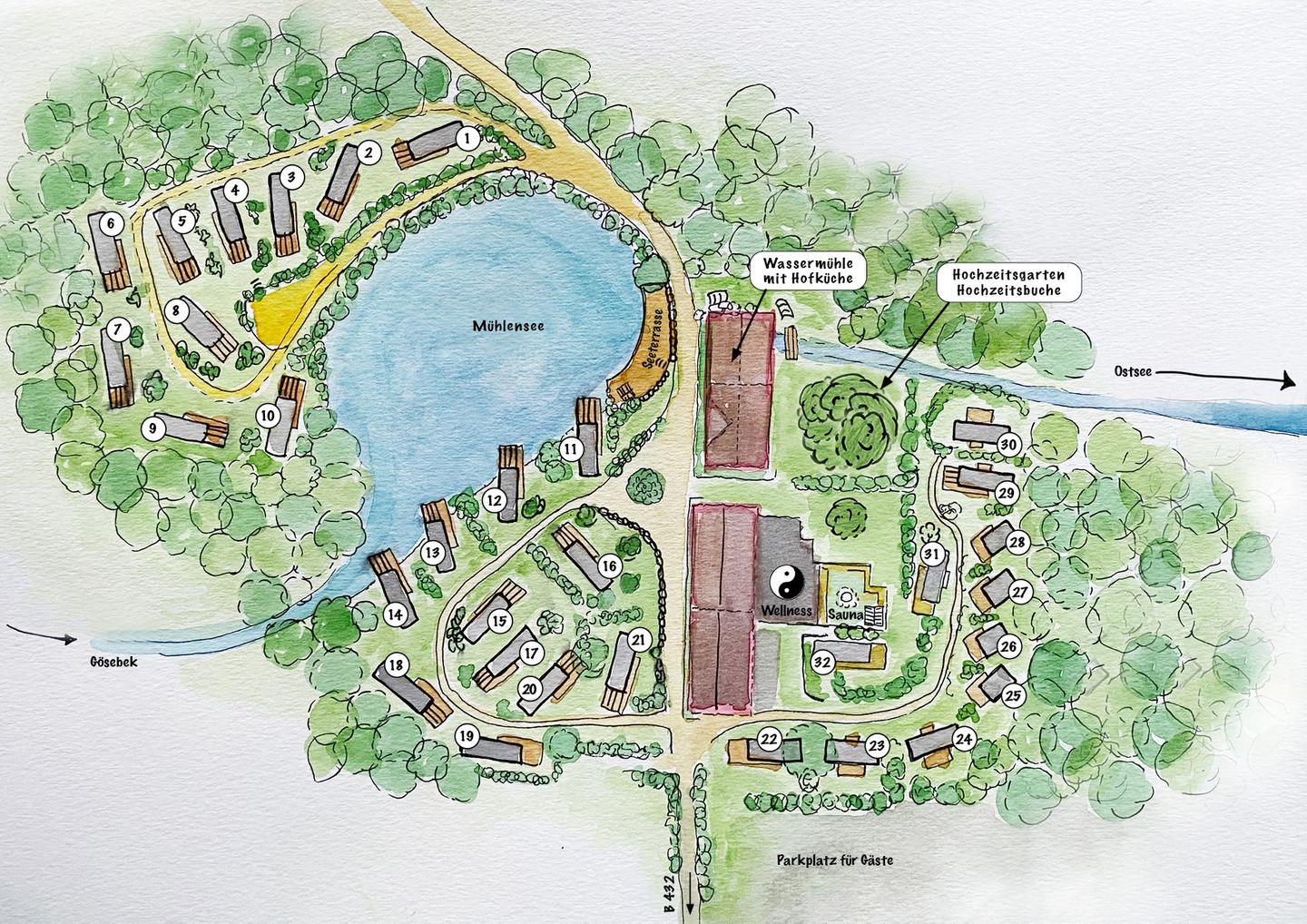 Moderne Ferienhäuser in Denkmal-Wassermühle nahe Ostsee, mit Spa, Restaurant und vielfältigen Aktivitäten in malerischer Natur.