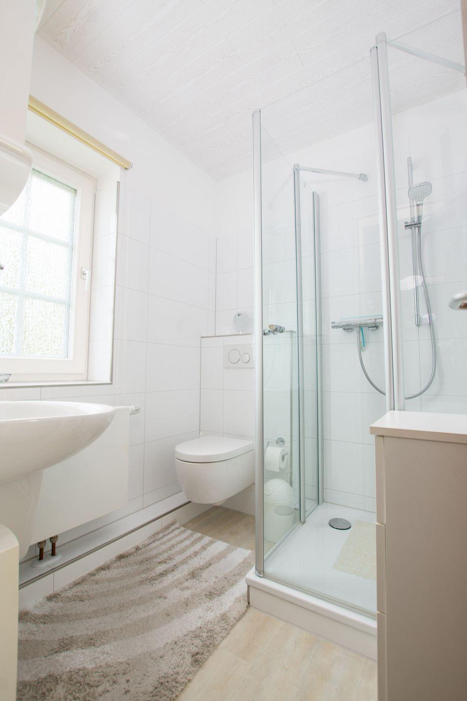 Das Badezimmer ist mit hellen Fliesen und einem großen Fenster ausgestattet. Es gibt eine Dusche, Waschtisch und WC.