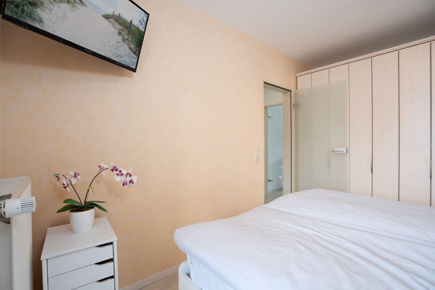 Der Schlafraum verfügt über ein Doppelbett (140 x 200/Einzelmatratzen) nebst Kleiderschrank mit ausreichendem Stauraum für Ihre Garderobe. Auch hier haben Sie Zutritt auf einen Balkon mit schönem Meerblick.