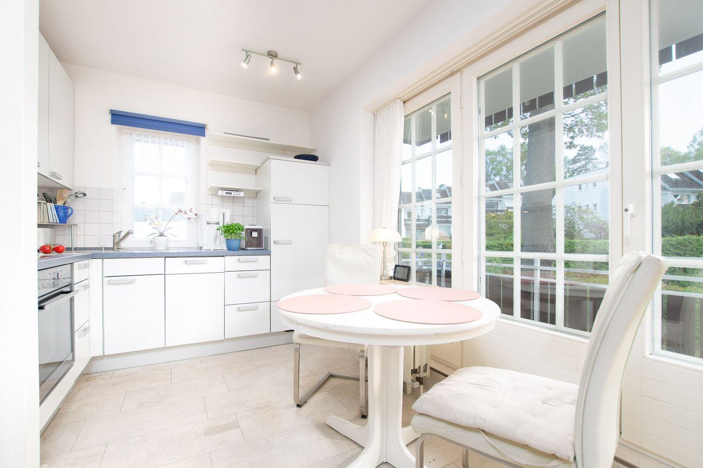 Über das Wohnzimmer gelangen Sie zum Essbereich und der offenen modernen Küche. Die Einbauküche bietet eine Komplettausstattung an Geschirr, Backofen, Wasserkocher, Toaster, Kaffeemaschine und Spülmaschine sowie sämtliche Kochutensilien, die Sie benötigen.