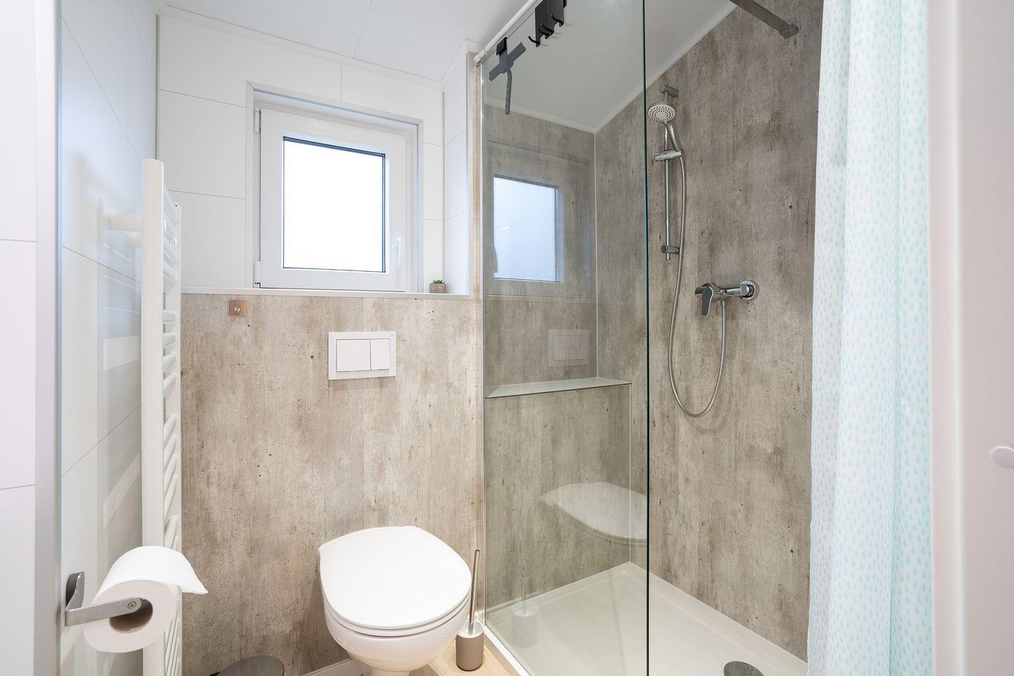 Das moderne Bad mit großer ebenerdiger Dusche und Fenster runden Ihre Bedürfnisse ab.