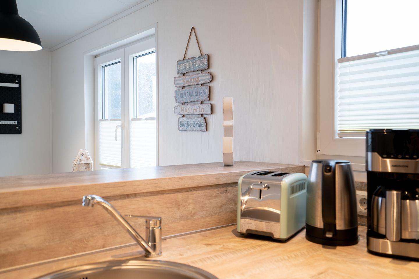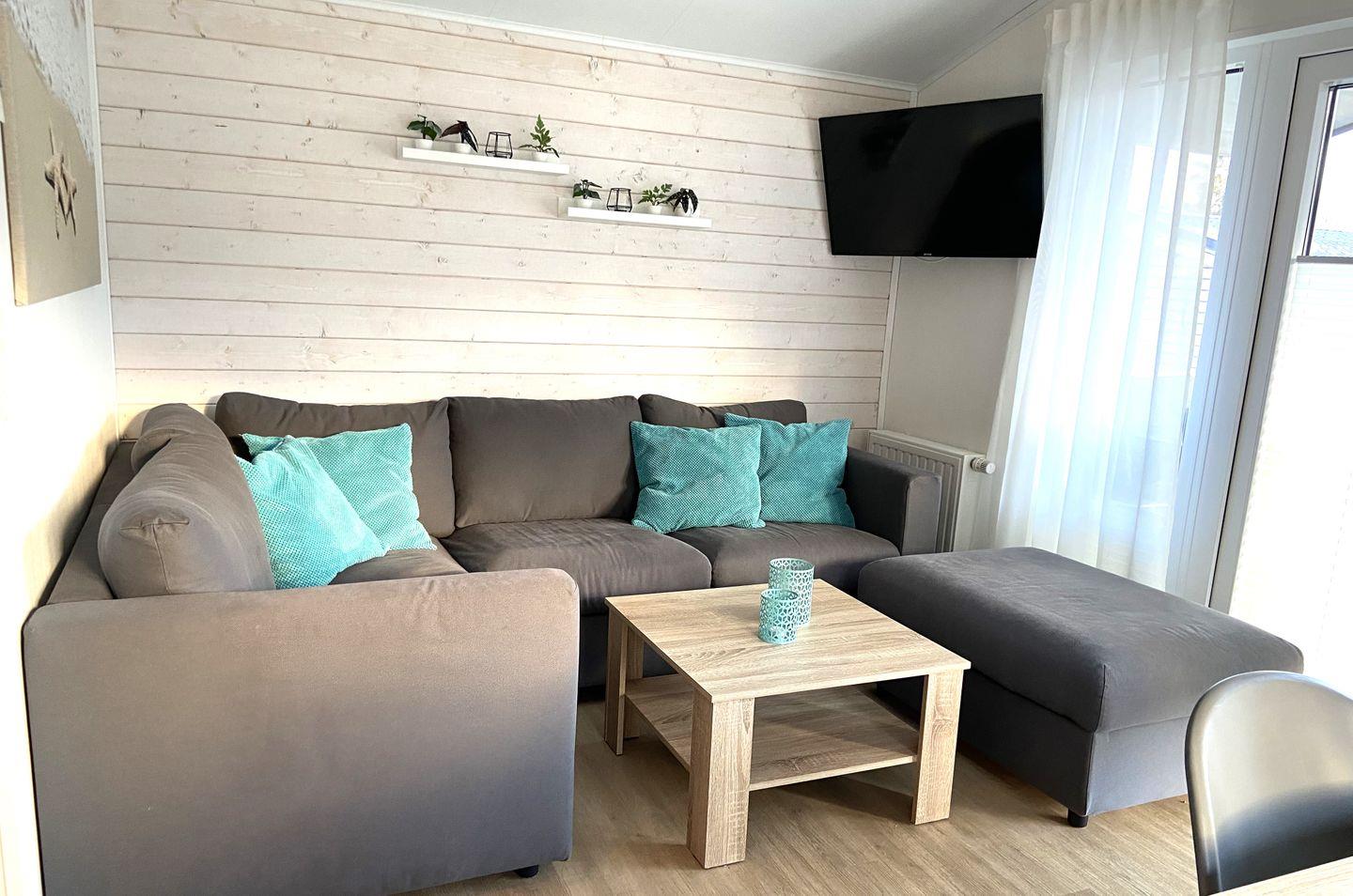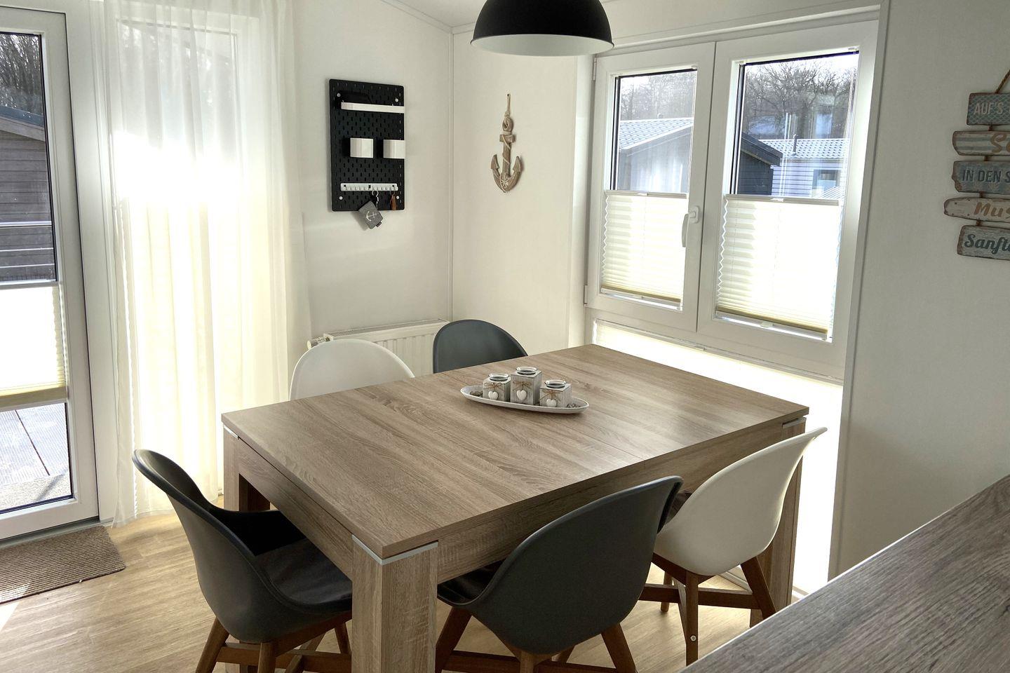 Das ca. 40m² große Mobilheim „Seeigel“ besteht aus einem offenen lichtdurchfluteten Wohn- und Essbereich, einer integrierten voll ausgestatteten Küche und zwei Schlafzimmern; ein Elternschlafzimmer mit Doppelbett 1,60 x 2,00m und ein Kinderzimmer mit Etagenbett für drei Personen 1,40 x 2,00m und 0,80 x 2,00m.