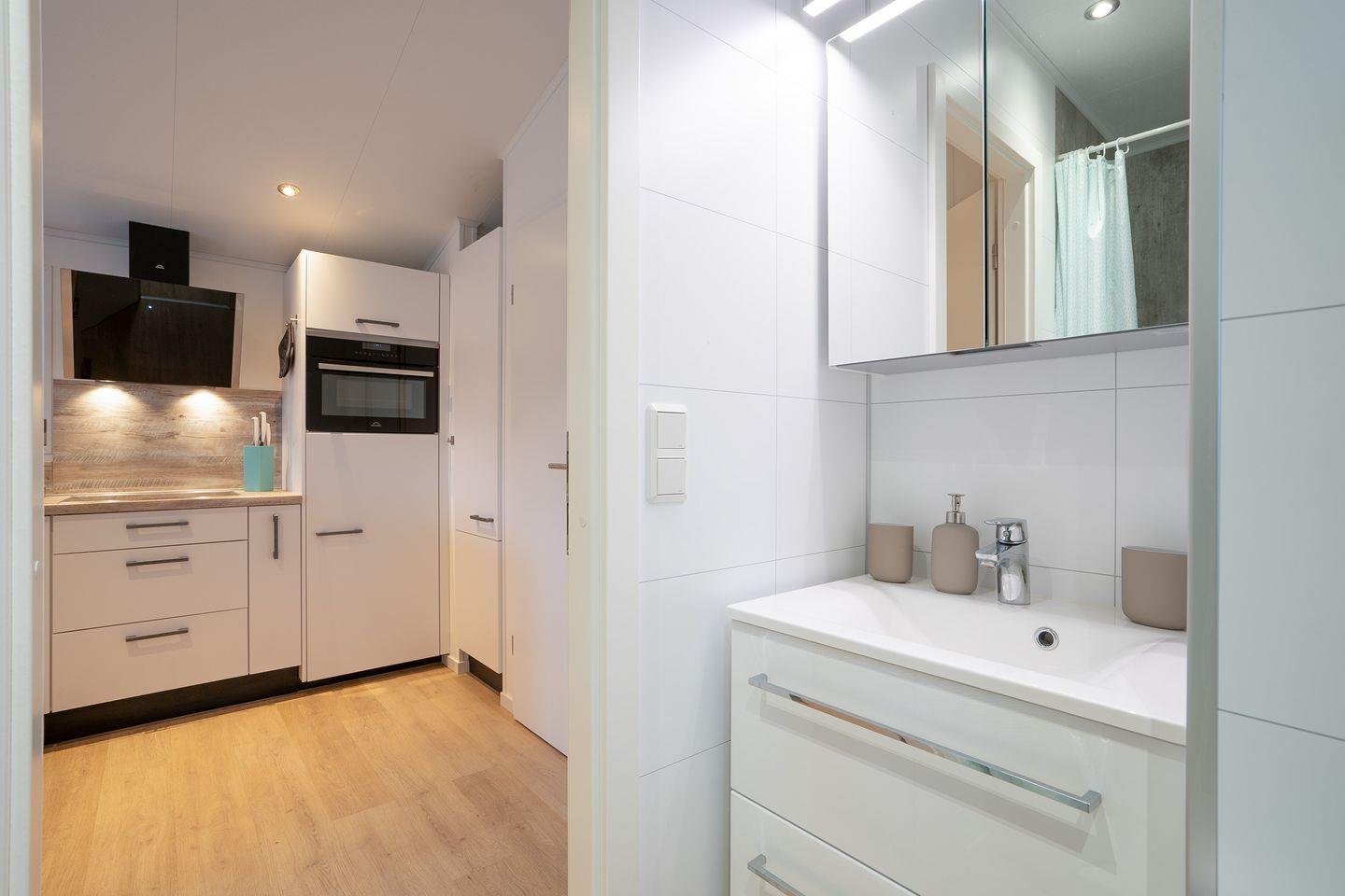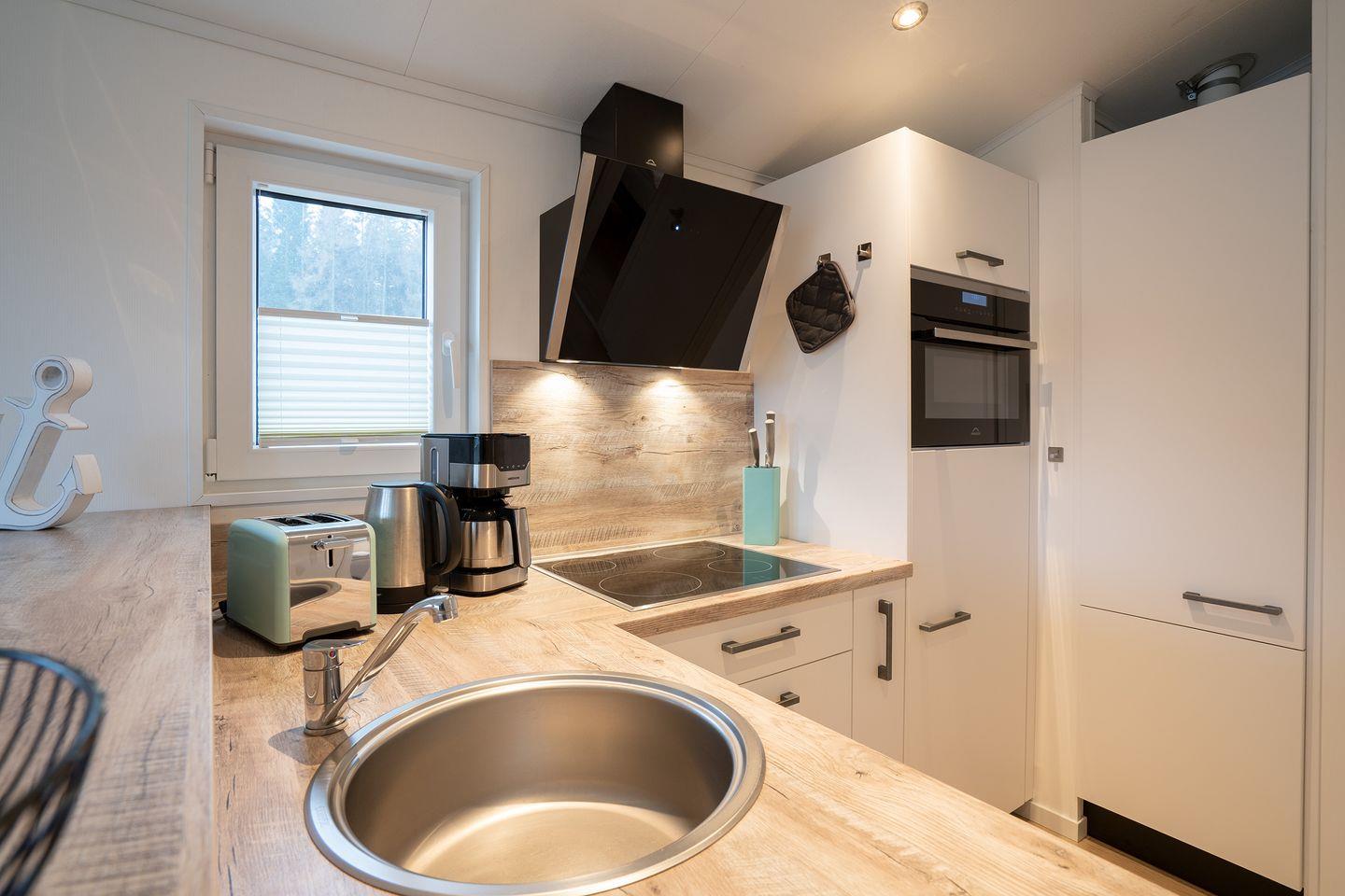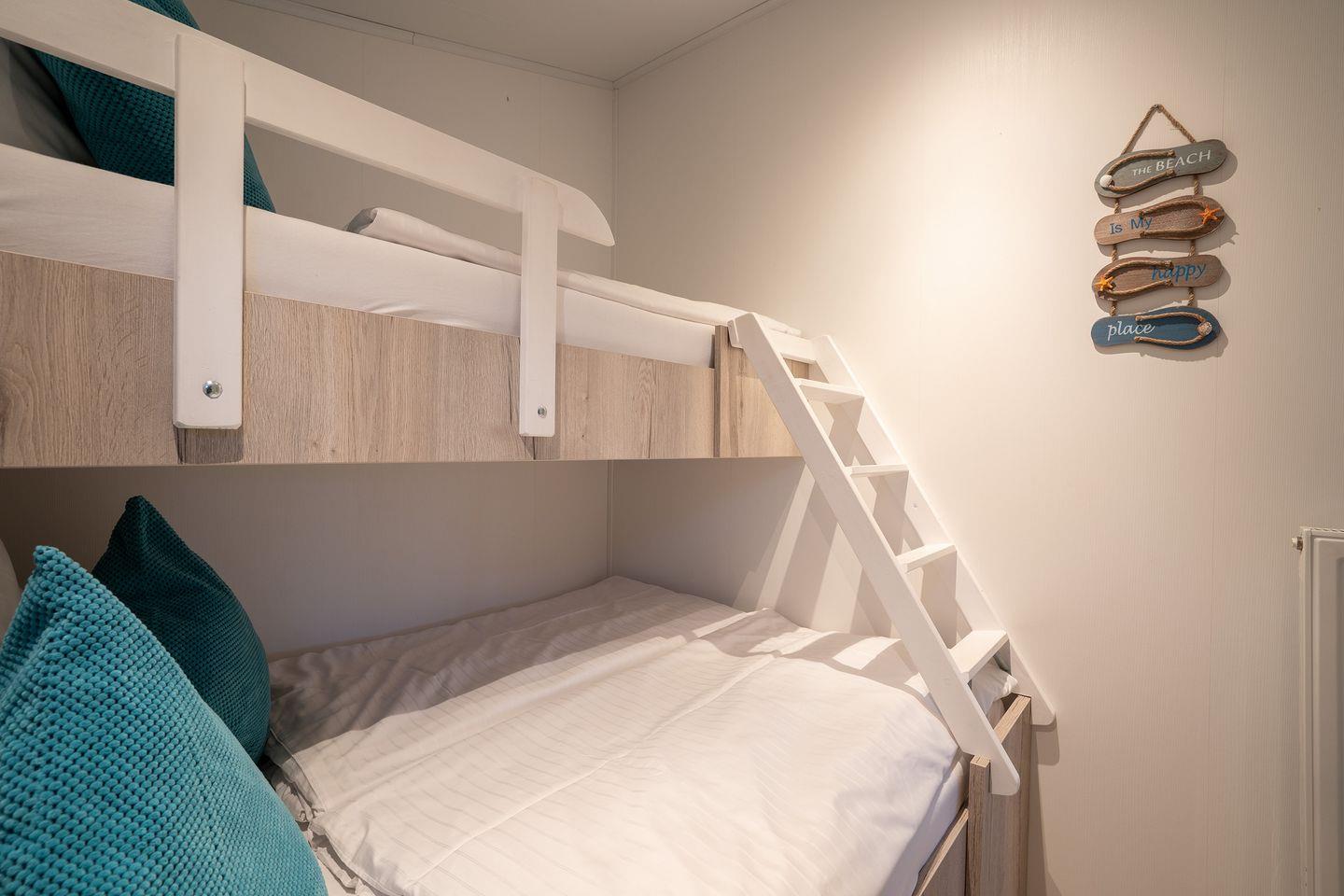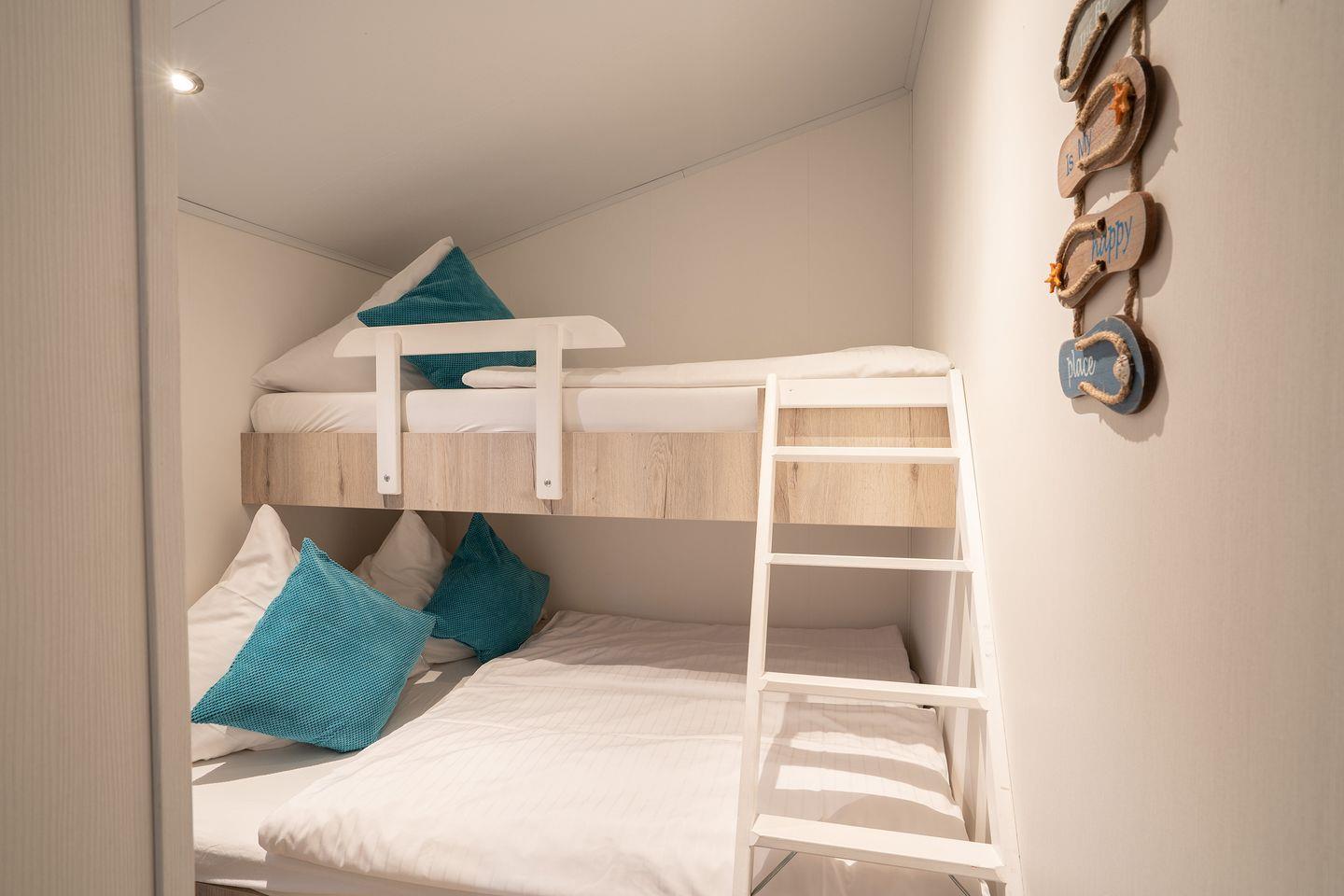 Das ca. 40m² große Mobilheim „Seeigel“ besteht aus einem offenen lichtdurchfluteten Wohn- und Essbereich, einer integrierten voll ausgestatteten Küche und zwei Schlafzimmern; ein Elternschlafzimmer mit Doppelbett 1,60 x 2,00m und ein Kinderzimmer mit Etagenbett für drei Personen 1,40 x 2,00m und 0,80 x 2,00m.