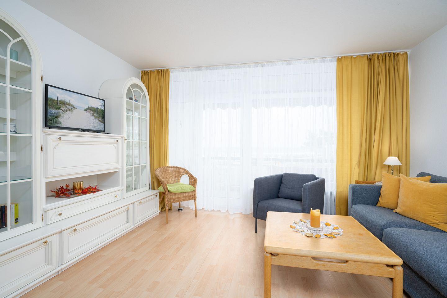 ca. 60qm großes 3-Zimmer -Seeblick- Appartement im 1.Wohngeschoss (Lift vorhanden) mit schönem Seeblick-Balkon Der Wohnraum ist ausgestattet mit einem Sofa, Couchtisch, Schrankwand mit TV und einem Esstisch.