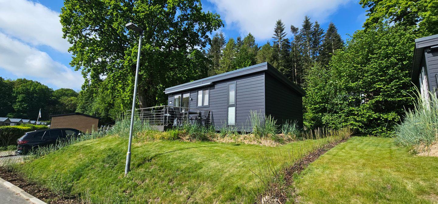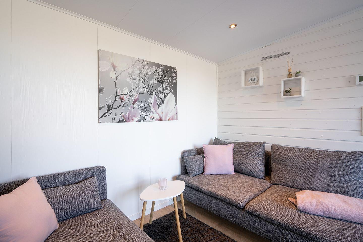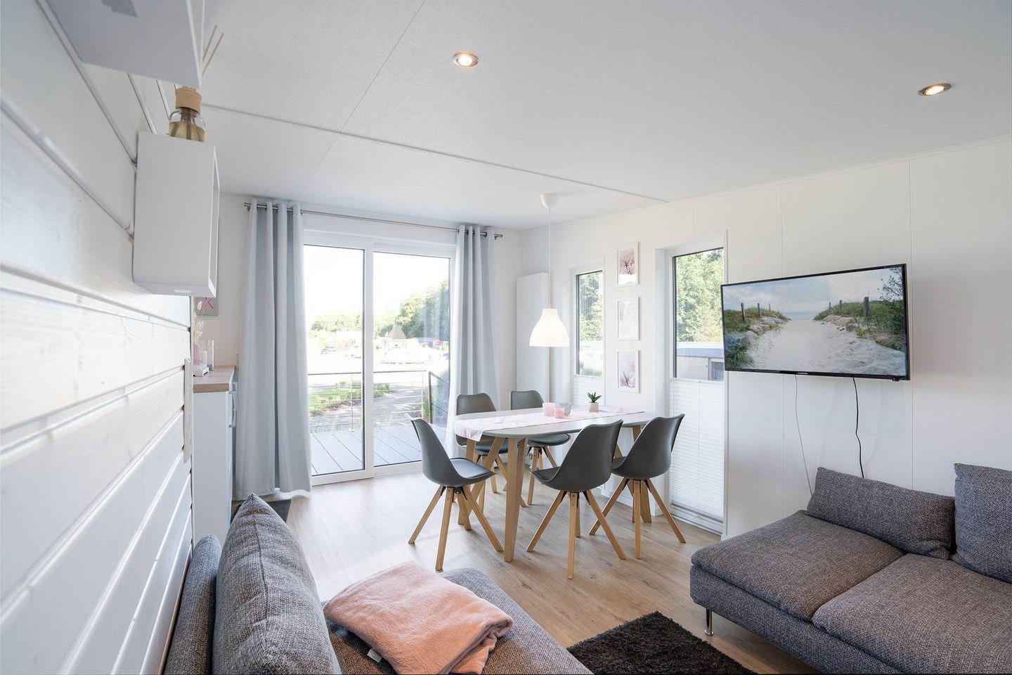 Modernes Mobilheim RELAX im Ostseecamp Scharbeutz mit Terrasse, Garten, WLAN und privatem Parkplatz.