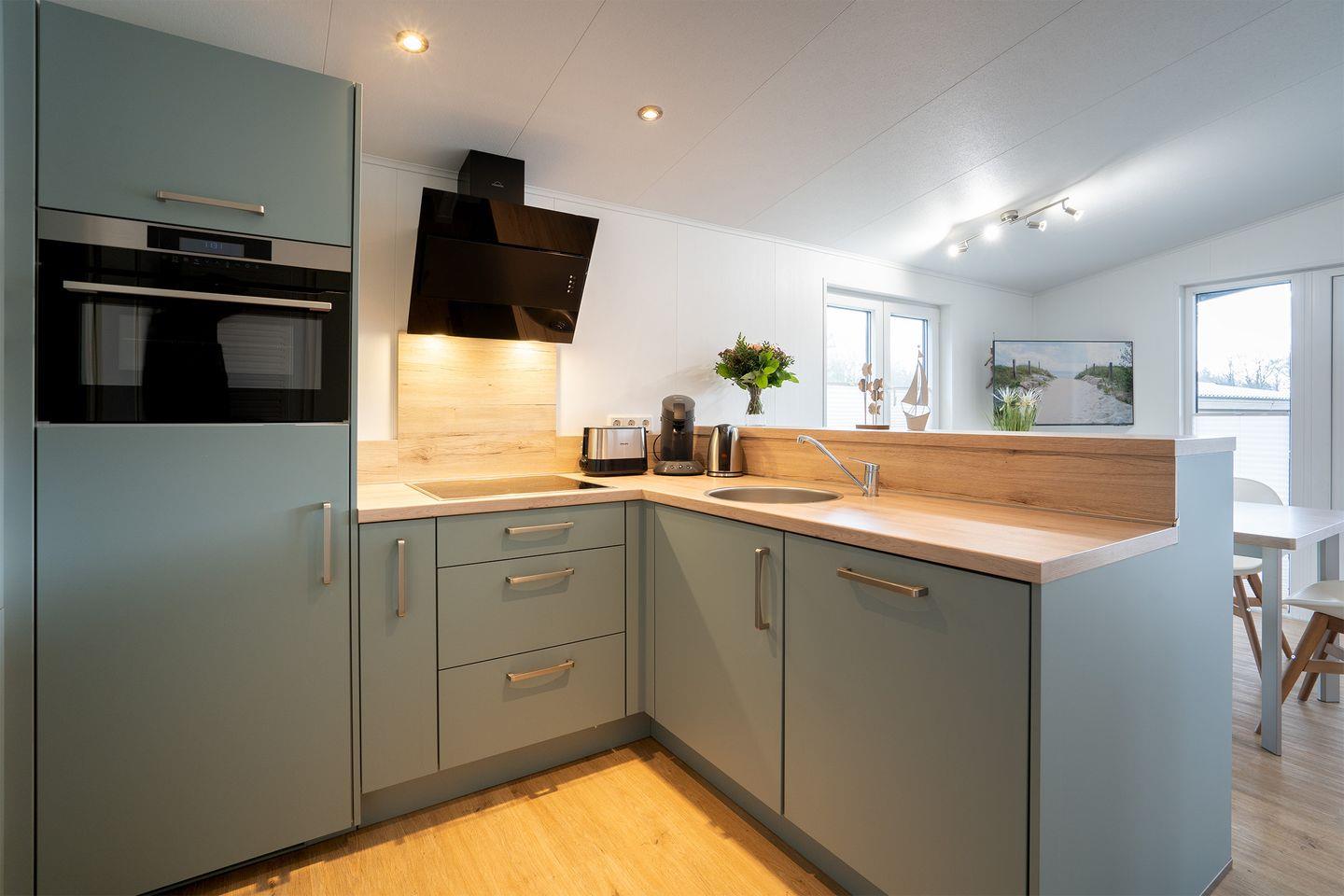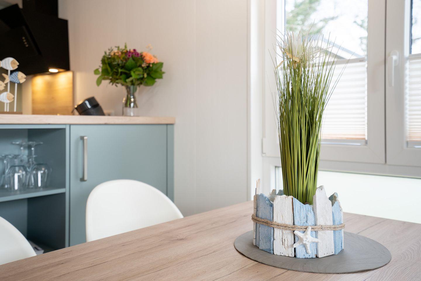 Das Ferienhaus Ju-Li verspricht auf ca. 45m² einen entspannten Urlaub für 4 bis 5 Personen. Die ausladende Sonnenterrasse lädt zu ausgiebigen Frühstücken und Grillabenden oder einfach nur zum Entspannen ein. Die voll ausgestattete, offene Küche (Induktionskochfeld, Backofen-/Mikrowellenkombi, Geschirrspülmaschine, Kühlschrank mit Eisfach, Toaster, Wasserkocher, Senseo-Kaffeemaschine, reichlich Küchenutensilien) lässt keine Wünsche offen.