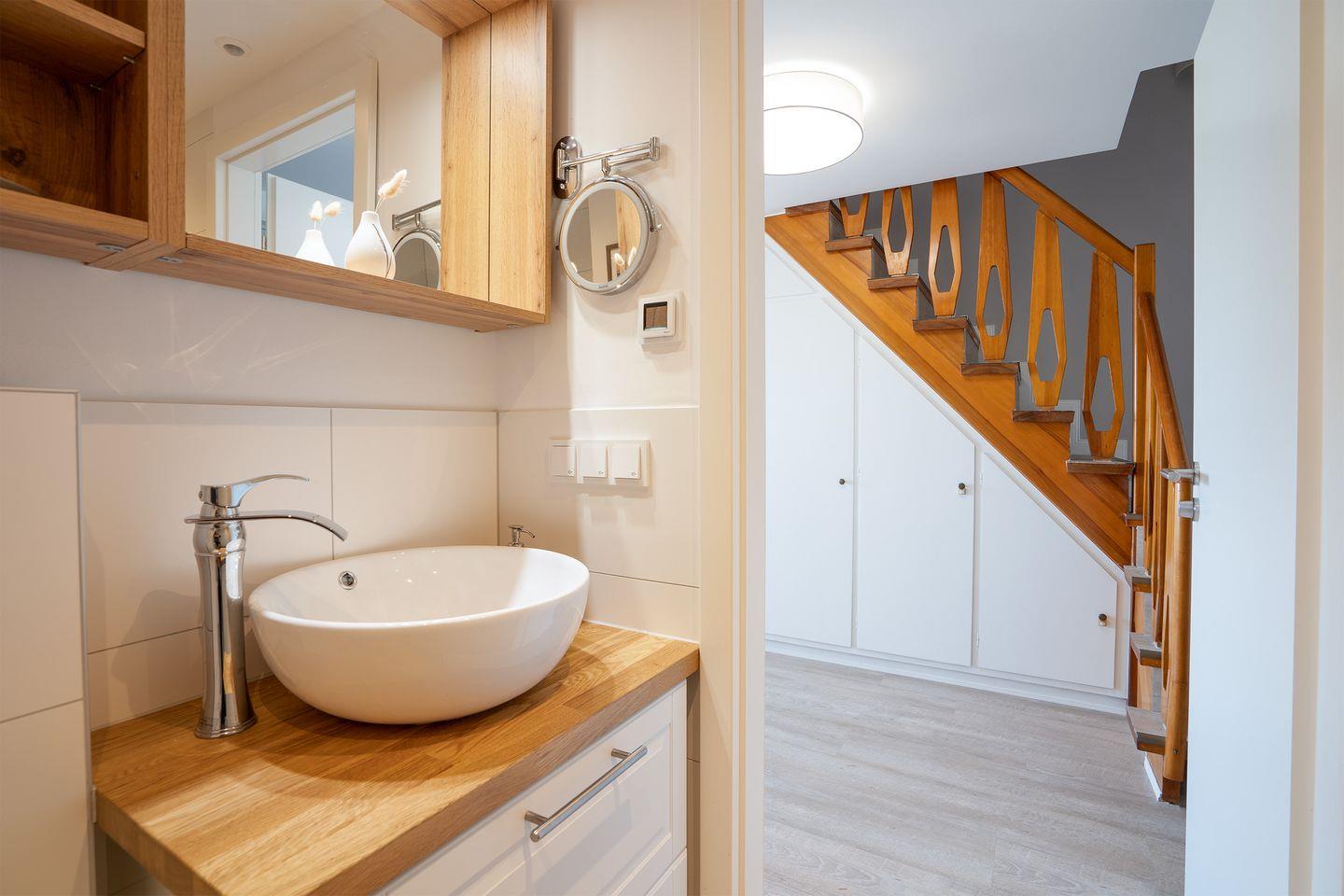 Das Badezimmer ist hell und mit einer bodengleichen Dusche mit zwei beweglichen Glaselementen zu nutzen. Im Bad befindet sich eine Fußbodenheizung und ein Handtuchheizkörper.