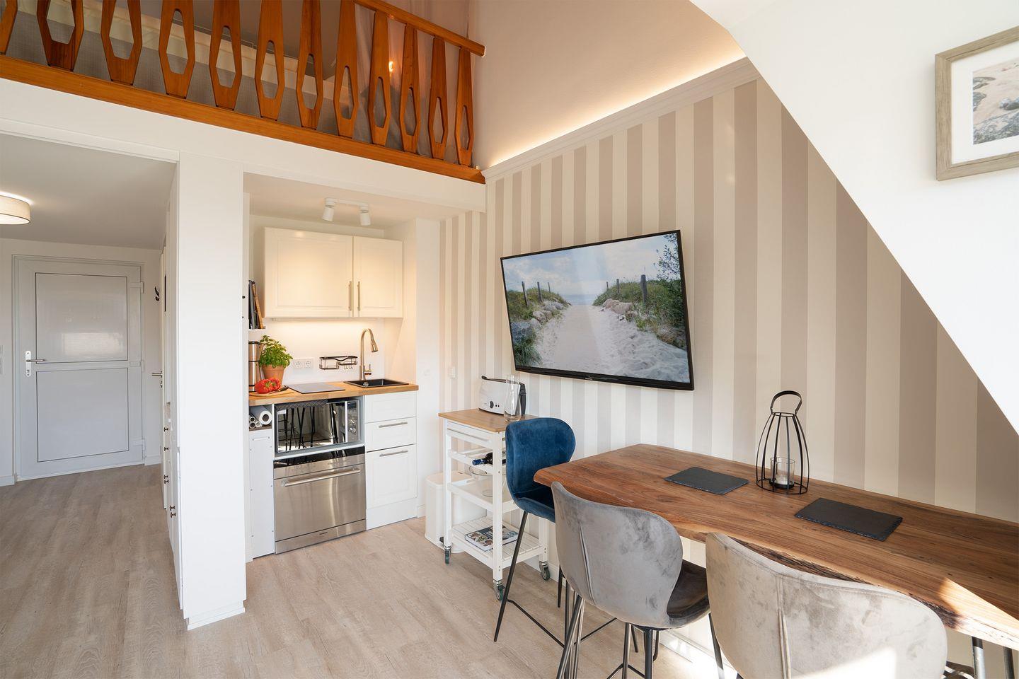Der großzügige Wohnraum ist mit einer Schlafcouch, sowie einem Flatscreen Fernseher ausgestattet und bietet eine ebenso schöne Aussicht. Die Küche verfügt über eine gute Ausstattung (Filter-Kaffeemaschine und Wasserkocher etc.) mit Geschirrspüler, Mikrowelle (Heißluft mit Grillfunktion) und einem Induktionsherd. Der erhöhte Essbereich mit einem Esstisch und Stühlen schließt sich der Küche an.