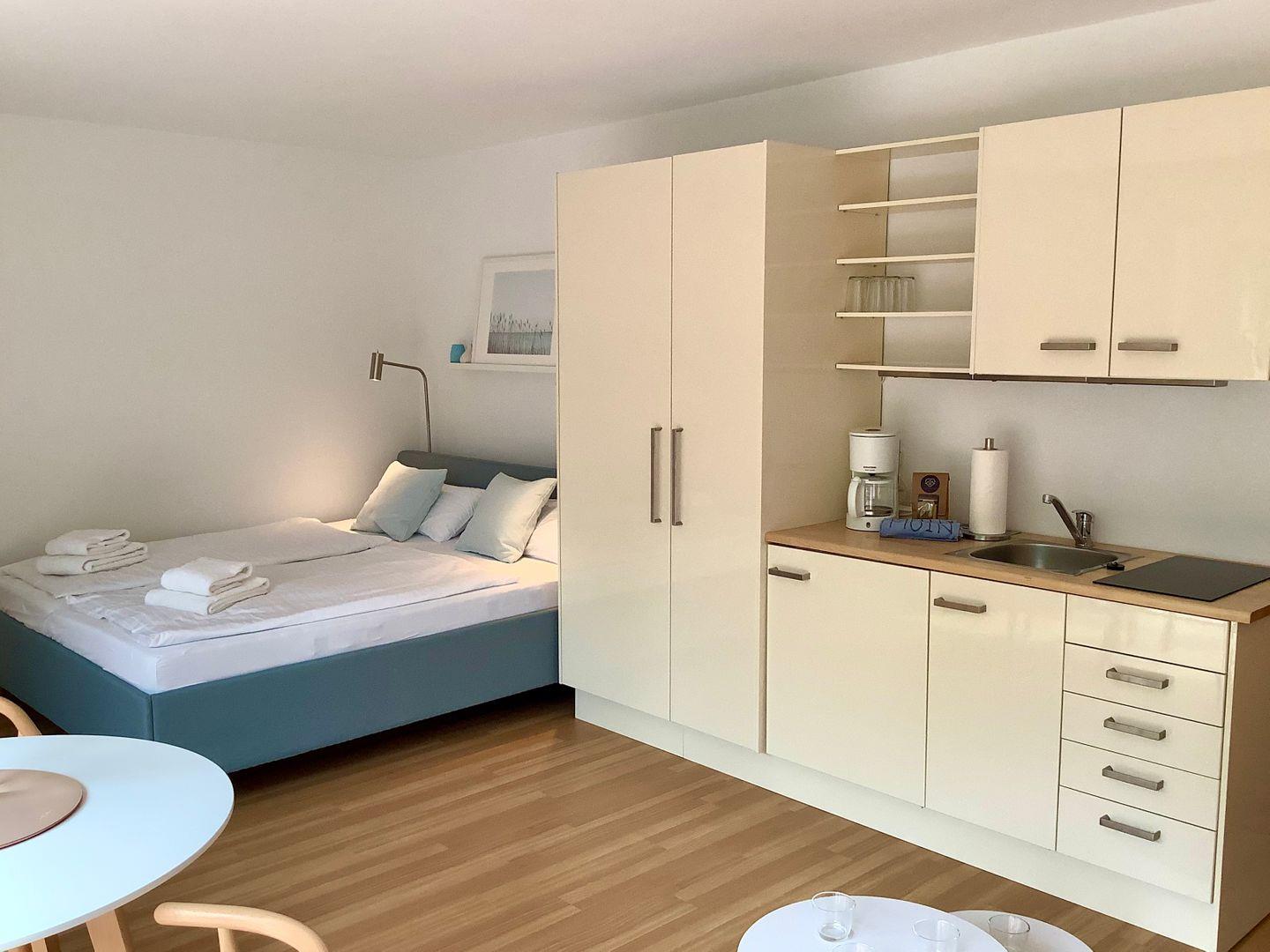 Erholung pur und absolute Ruhe mit direktem Gartenzugang zum Naturgarten. Das frische renovierte Einzimmerapartment erwartet Sie mit einem neu eingerichteten Wohn-/ Schlafzimmer mit neuem Polsterbett und hochwertigen Geltexmatratzen für einen erholsamen Schlaf. Die Verdunklungsvorhänge lassen bei Bedarf die Sonnenstrahlen draußen. Der Smart TV und ein AlexaEcho lassen garantiert keine Langeweile aufkommen. Die kleine Küchenzeile mit 2-Platten Ceranfeld und Kühlschrank lässt kleine Kochwünsche realisieren. Die Terrasse mit Blick in den Garten gibt Ihnen die Gelegenheit morgens in der Natur zu frühstücken oder den Abend in Ruhe ausklingen zulassen. Gartenmöbel stehen ebenfalls zur Verfügung.
