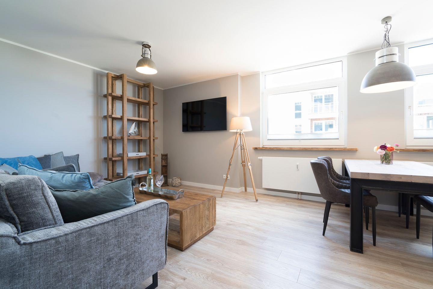 Willkommen in der modernen 51 qm großen 2-Zimmer-Nichtraucher-Ferienwohnung, ideal für Euren trendigen Urlaub am Meer. Die Einrichtung im "Cosy Industrial Style" kombiniert Gemütlichkeit mit einem modernen Flair, was die Wohnung besonders ansprechend macht. Durch den langen Flur der Wohnung erhaltet Ihr einen angenehmen Abstand zwischen dem geselligen Wohn-Ess-Küchenbereich und der Ruhezone im Schlafzimmer. Das Appartementhaus bietet eine Tiefgarage mit extra Fahrradabstellraum, die ihr je nach Verfügbarkeit kostenlos nutzen könnt, jedoch ohne Anspruch auf einen festen Stellplatz. Ein Fahrstuhl bringt euch direkt in die erste Etage zu Eurer Puro-Ferienwohnung. In der Wohnung gibt es kostenfreies WLAN (bei Störungen kein Anspruch auf Erstattung oder Ersatz).