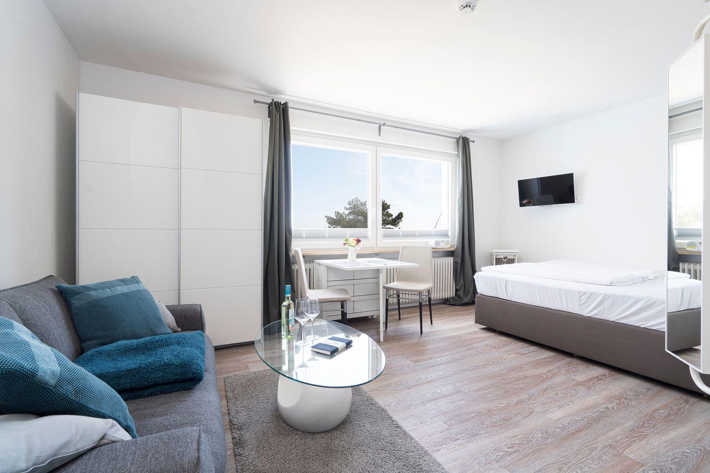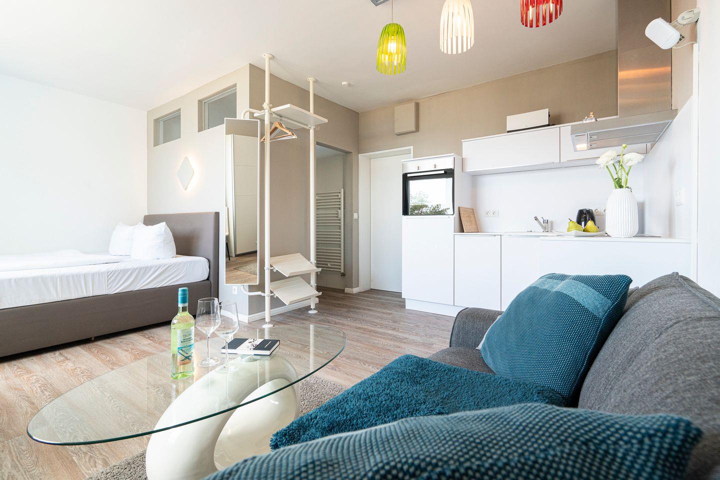Entdeckt unsere charmante 30 qm große 1-Zimmer-Nichtraucher-Ferienwohnung im Capolino Suite, gelegen direkt an der Strandallee und somit in bester Lage zur Strandpromenade. Modern und hell eingerichtet, bietet diese Wohnung den idealen Rückzugsort für Paare oder Einzelreisende. Dank der zentralen Lage könnt ihr die direkte Nähe zum Strand genießen und habt das lebhafte Treiben der Scharbeutzer Promenade direkt vor der Tür. Das Gebäude verfügt über eine Tiefgarage mit Fahrradabstellraum, deren Nutzung je nach Verfügbarkeit möglich ist, und einen Fahrstuhl, der euch direkt in eure Etage bringt. In der Wohnung gibt es kostenfreies WLAN (bei Störungen kein Anspruch auf Erstattung oder Ersatz). Die Wohnung befindet sich in einer lebhaften Lage mit zwei Restaurants und einer Cocktail-Bar direkt im Haus – ideal für alle, die das Urlaubsflair nicht nur am Strand, sondern auch bei gutem Essen und einem Drink genießen möchten.