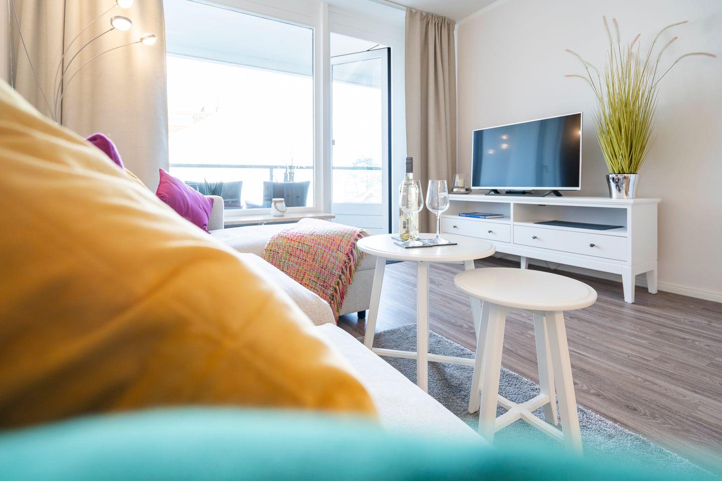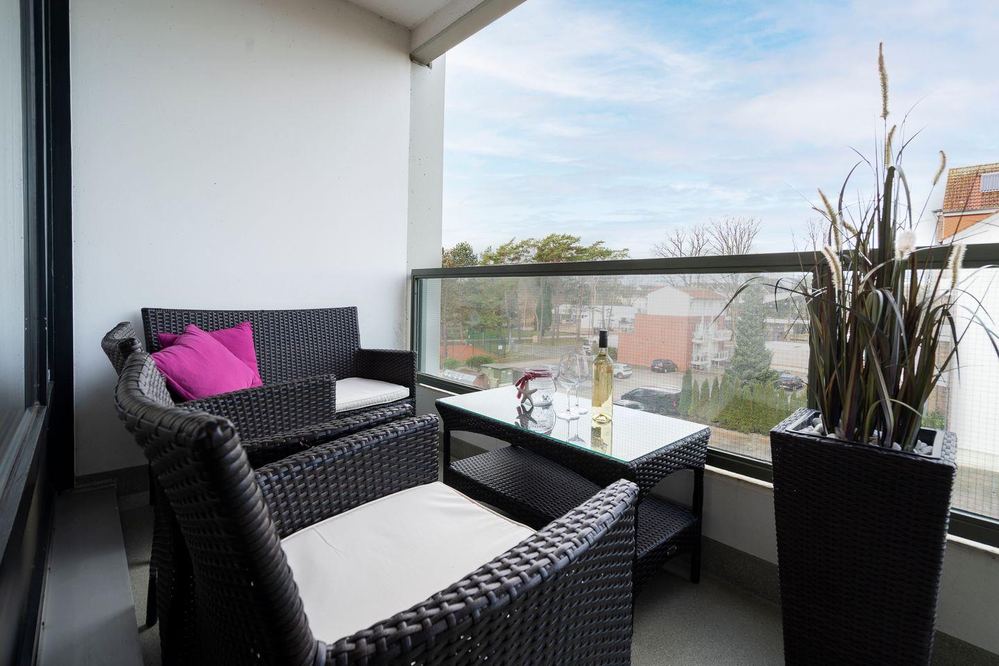 Willkommen in der komfortablen Ferienwohnung Nr. 206, die bequem per Fahrstuhl in der zweiten Etage des Gebäudes zu erreichen ist. Die helle und freundlich gestaltete Wohnung mit farbigen Akzenten bietet ein einladendes Ambiente, das euren Urlaubstag aufhellt. Von sowohl dem Wohnbereich als auch dem Schlafzimmer aus habt ihr Zugang zum Balkon in Nord-West-Lage, von wo ihr seitlich die Ostsee und direkt den Kurpark erblicken könnt. Genießt entspannende Momente auf den komfortablen Loungemöbeln des Balkons und lasst den Blick über die malerische Umgebung schweifen.