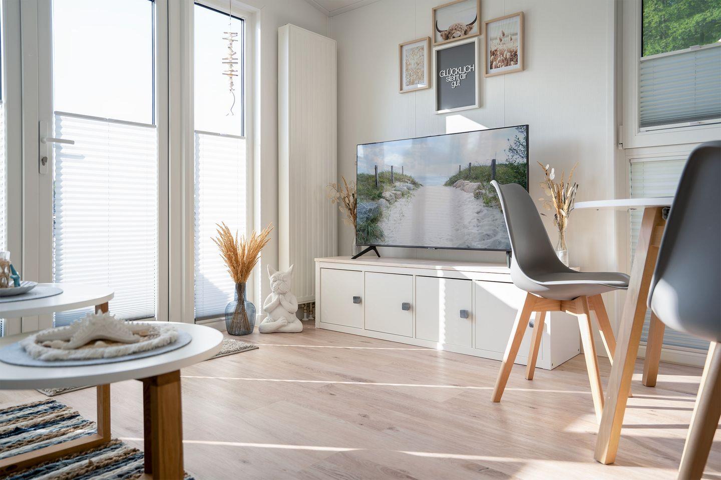Ihr komfortabel eingerichtetes Ferienhaus verfügt über ein lichtdurchflutetes Wohnzimmer mit gemütlichem, großem Sofa (1,80 m) und großem Flatscreen-Fernseher, der auch verschiedene Streaming-Login-Möglichkeiten bietet.