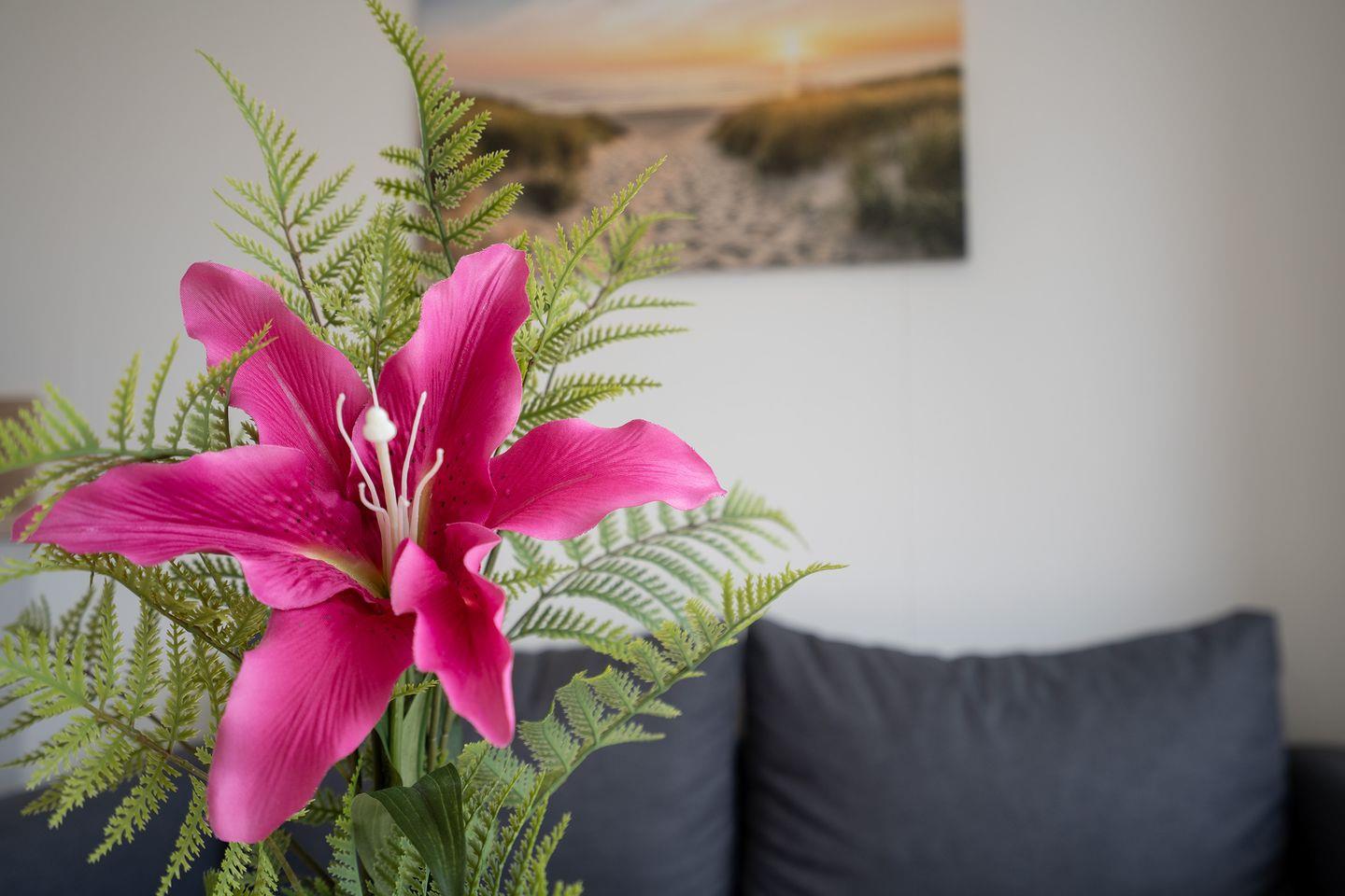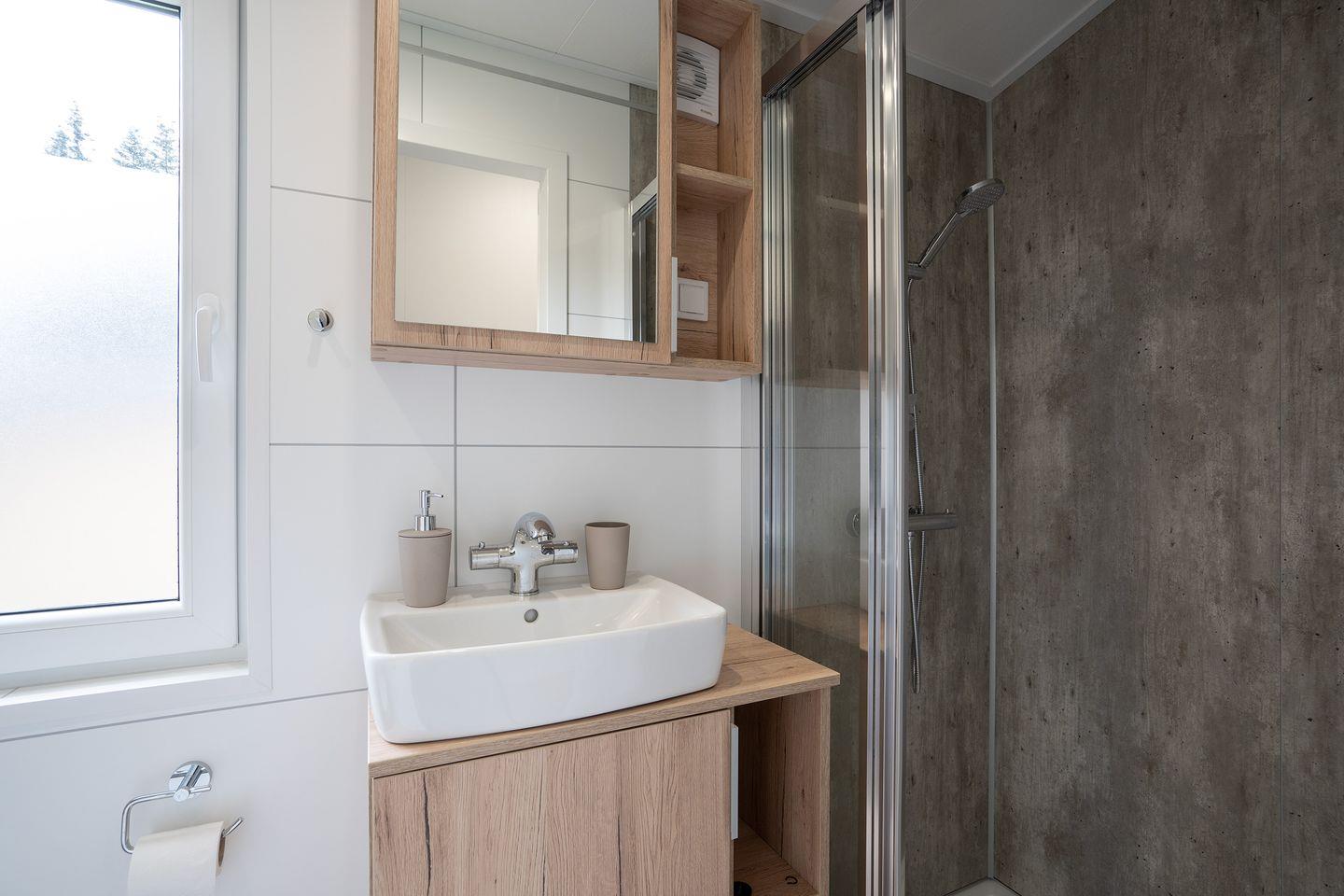 Die moderne Wohnküche ist bestens ausgestattet und lädt zum kulinarischen experimentieren ein. Eine Kaffeemaschine, ein Wasserkocher sowie einen Toaster stehen für Sie bereit. Ein Esstisch aus naturbelassener Eiche sowie gemütliche Stühle schaffen ein Ambiente, dass gemeinsame Mahlzeiten zu einem Fest der Sinne macht. Das Sofa verwandelt sich bei Bedarf in ein zusätzliches Bett, während der 43“ Smart-TV an regnerischen Tagen für Unterhaltung sorgt. Großzügige Fenster bieten Blicke auf den umliegenden Wald oder das Ostseecamp Lübecker Bucht.