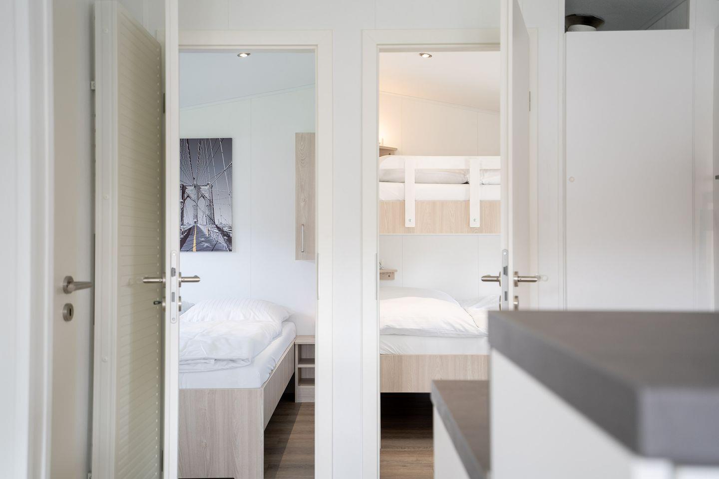 Das Chalet Haffkrug 55 bietet Ihnen einen offenen Wohn-Essbereich mit sehr gut ausgestatteter Küche, in der Sie an einem Esstisch mit der ganzen Familie sitzen können, einem Schlafzimmer mit einem 1,60 x 2,00m Bett und einem Schlafzimmer mit einem 1,40 x 2,00m Bett über dem sich ein 0,80 x 2,00m Hochbett (nur für Kinder) befindet. Sie finden hier Platz für bis zu 4 Erwachsene + 1 Kind mit allem Komfort, den Sie benötigen. In der Grundüberlegung ist das Objekt geplant für eine Familie mit bis zu 3 Kindern.