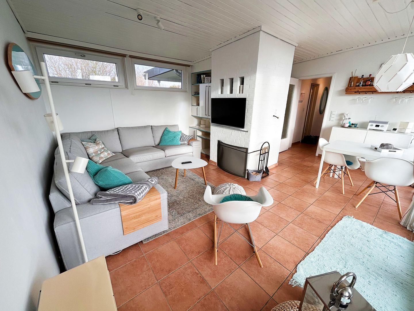 Der offene Kamin ist ein echtes Highlight und lädt zu gemütlichen Abenden mit einem Glas Wein auf der bequemen Eck-Couch ein.