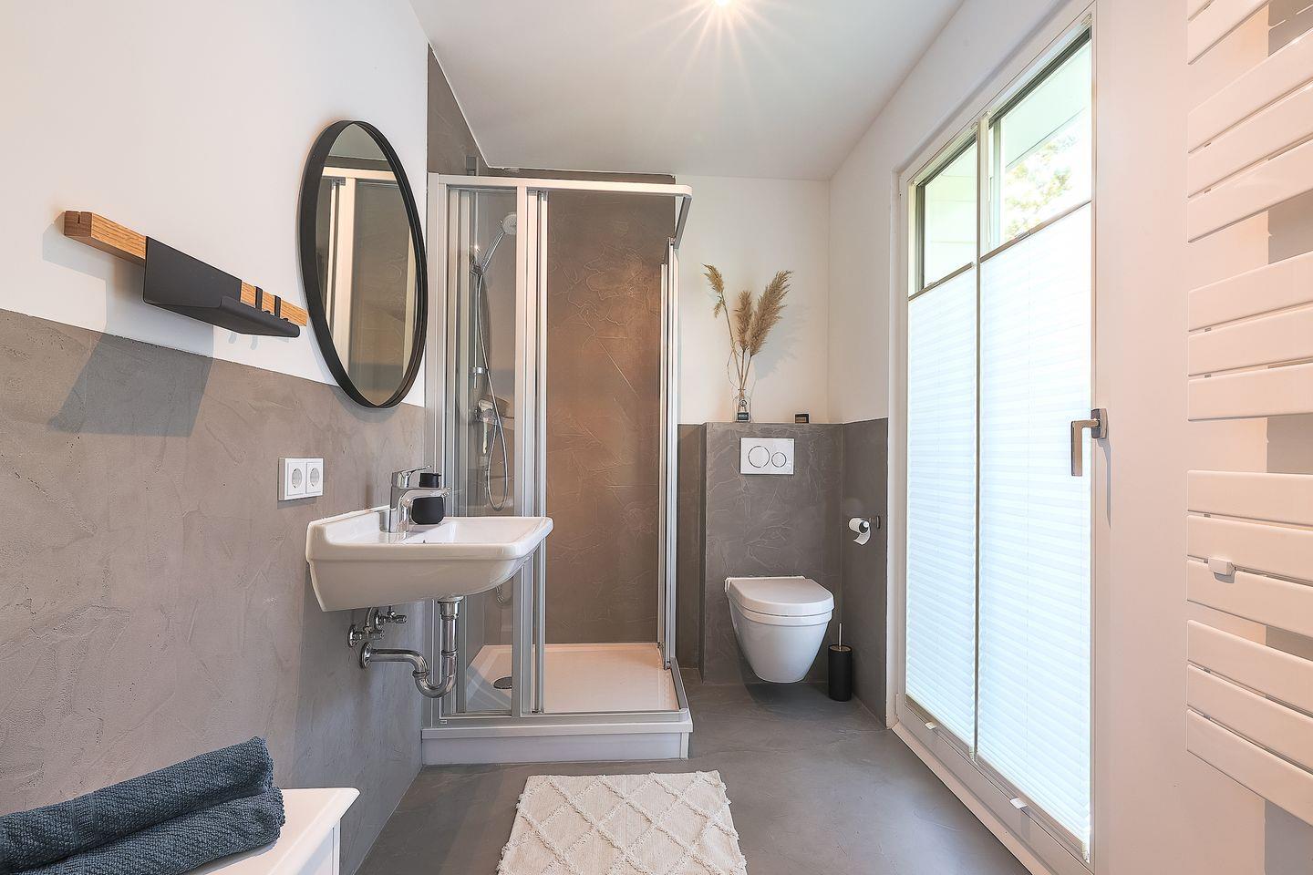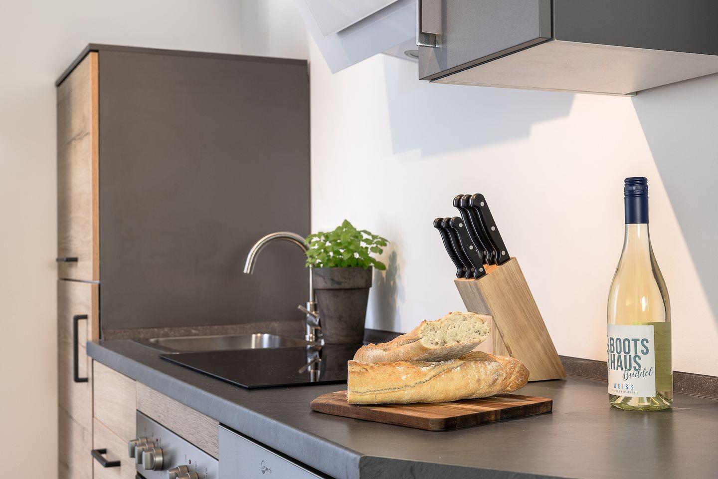 Das gemütliche Schlafzimmer ist mit einem komfortablen Boxspringbett ausgestattet, das Ihnen erholsamen Schlaf garantiert. Im offenen Wohn- und Essbereich können Sie entspannte Stunden verbringen. Die moderne Einbauküche verfügt über alle nötigen Geräte, um bequem Mahlzeiten zuzubereiten. Bodentiefe Fenster lassen viel Tageslicht herein und schaffen eine helle, einladende Atmosphäre.