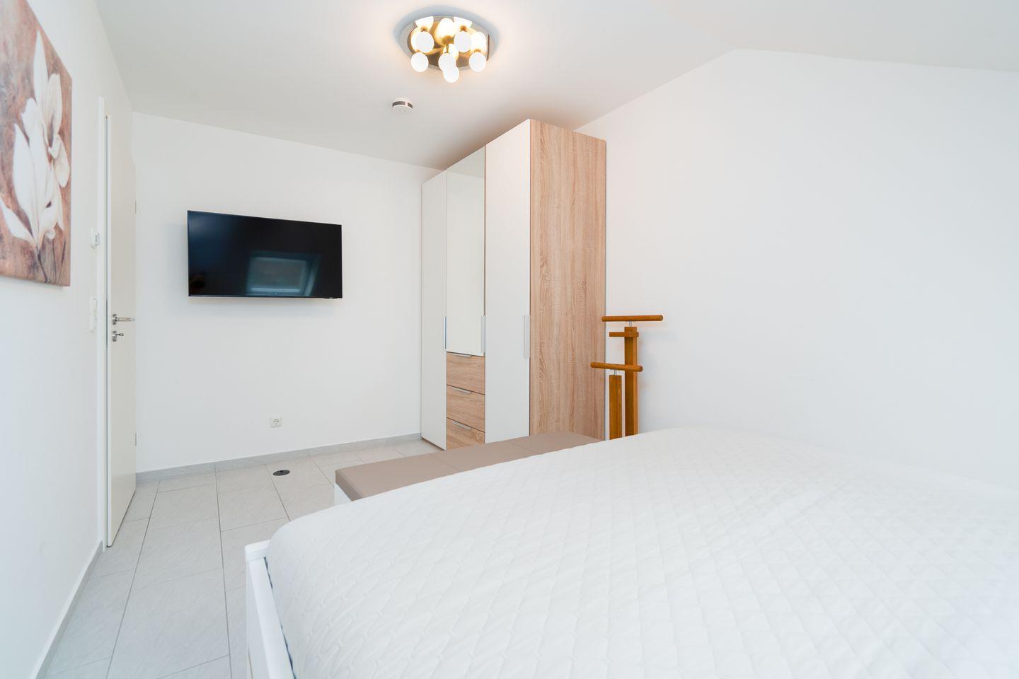 Der großzügig geschnittene Wohn-/Essbereich mit offener, voll ausgestatteter Küche und großen Fenstern sorgt für eine helle und freundliche Atmosphäre. Die gemütliche Sofaecke und der Essplatz neben der offenen Küche laden zum geselligen Beisammensein ein. Auf der schönen, geschützten Dachterrasse können Sie den Sonnenuntergang bei einem Sundowner in vollen Zügen genießen. Beide Schlafzimmer sind mit einem Doppelbett (1x 160 cm x 200 cm und 1x 200 cm x 200 cm Breite), jeweils einem Kleiderschrank und TV-Gerät ausgestattet.