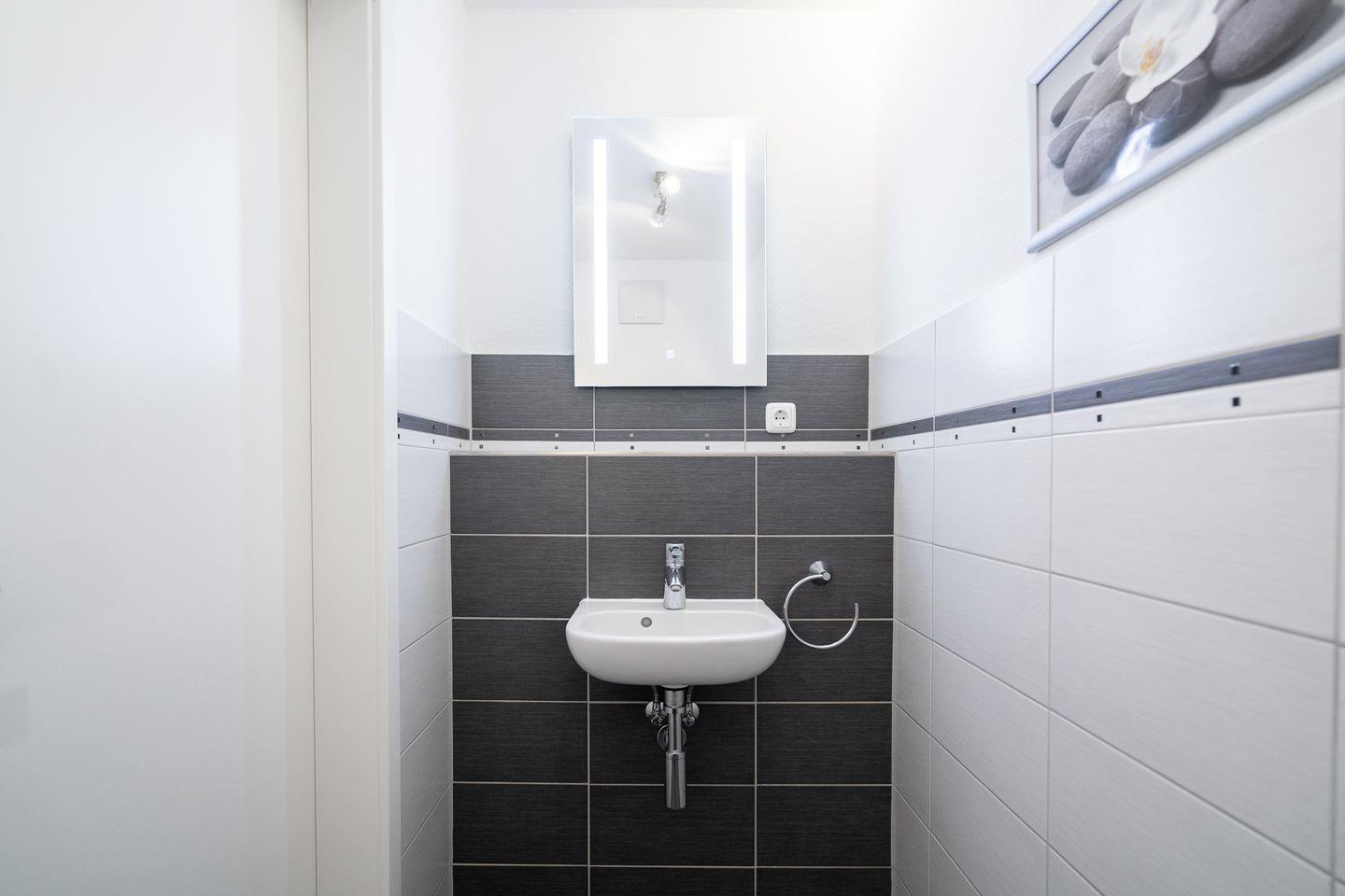 Das moderne und geräumige Badezimmer verfügt über eine bodentiefe Dusche und eine eigene Waschmaschine und -trockner. Zusätzlich gibt es ein separates Gäste-WC.