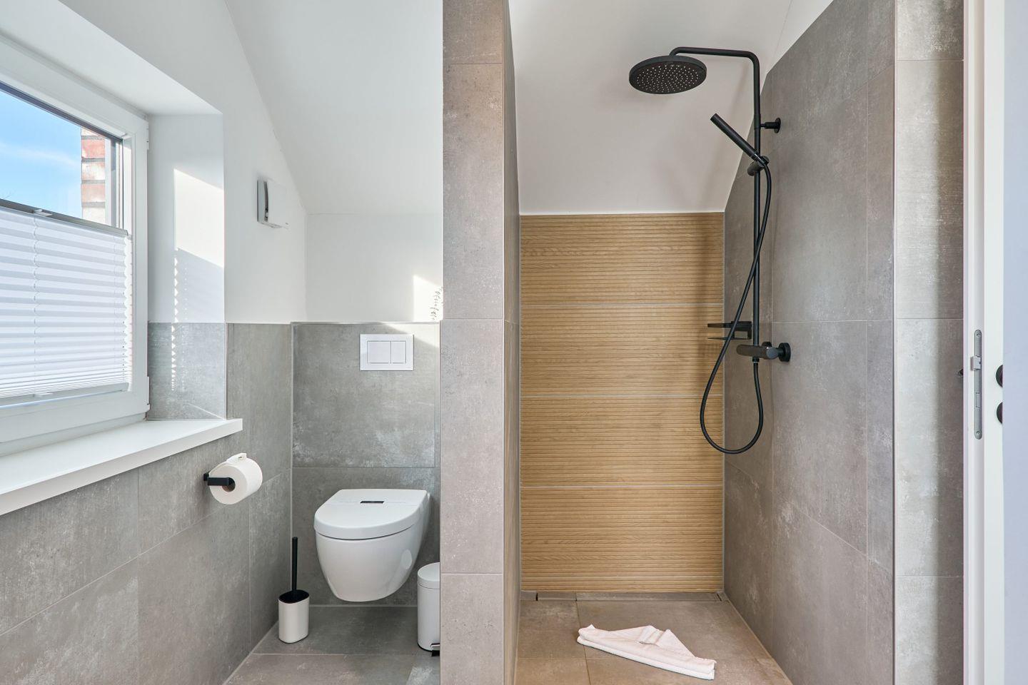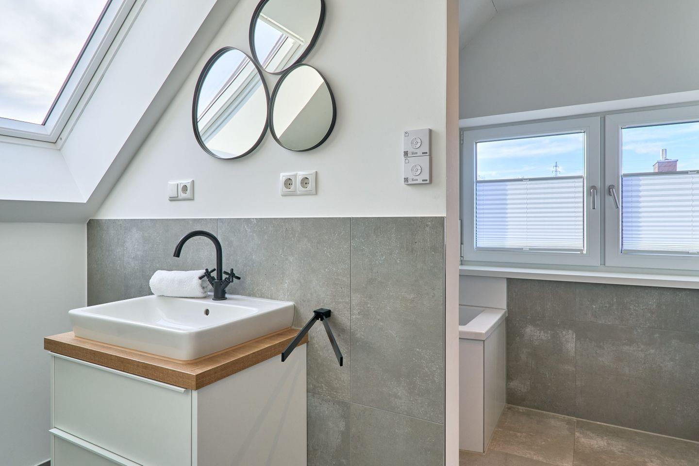 Für zusätzlichen Komfort gibt es zwei moderne Badezimmer. Eines bietet eine großzügige Badewanne und eine Dusche, während das zweite ebenfalls eine Dusche besitzt. Beide Bäder sind in neutralen Naturtönen gehalten und mit Pflanzen gestaltet, die eine angenehme Wohlfühlatmosphäre schaffen. Ein Föhn ist ebenfalls vorhanden.