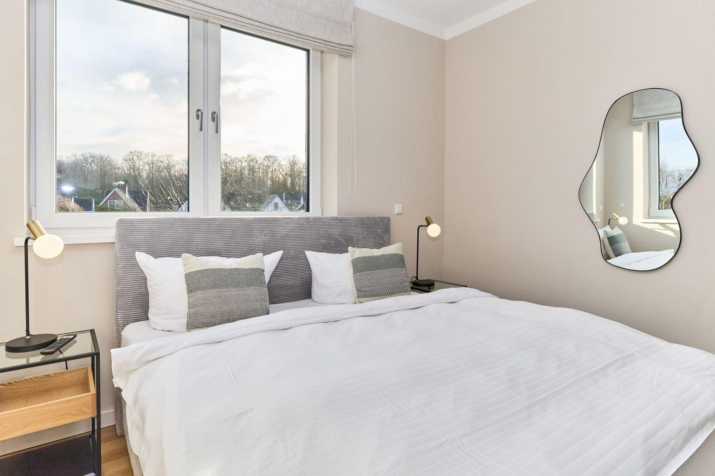 Die Wohnung umfasst drei stilvoll eingerichtete Schlafzimmer. Zwei Zimmer sind mit einem komfortablen Boxspringbett (180x200 cm), einem 32-Zoll-Flachbildfernseher und geräumigen Kleiderschränken ausgestattet. Im dritten Schlafzimmer findet Ihr ein Boxspringbett (160x200 cm), ebenfalls mit Kleiderschrank und zudem einem Schreibtisch, der auch als Rückzugsort oder Arbeitsplatz dient.