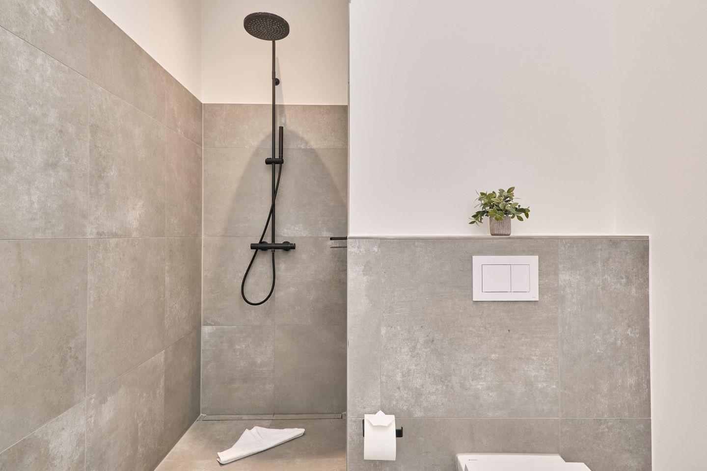 Zwei stilvolle Badezimmer in neutralen Naturtönen machen die Wohnung zu einer kleinen Wohlfühloase: Das größere Bad bietet eine Badewanne und eine separate Dusche, das zweite Bad ist mit einer geräumigen Dusche ausgestattet. In beiden Badezimmern stehen Pflanzen, die für eine beruhigende Atmosphäre sorgen.