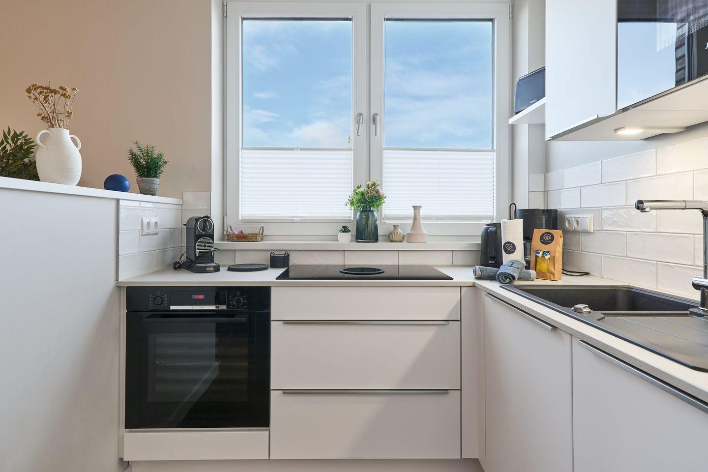 Die Dachterrasse ist ein weiteres Highlight der Wohnung: Hier könnt Ihr in der Abendsonne entspannen und bei einem geselligen Grillabend den hochwertigen Weber-Elektrogrill nutzen. Bequeme Sitzgelegenheiten und ein gemütlicher Hängestuhl bieten reichlich Platz zum Entspannen.