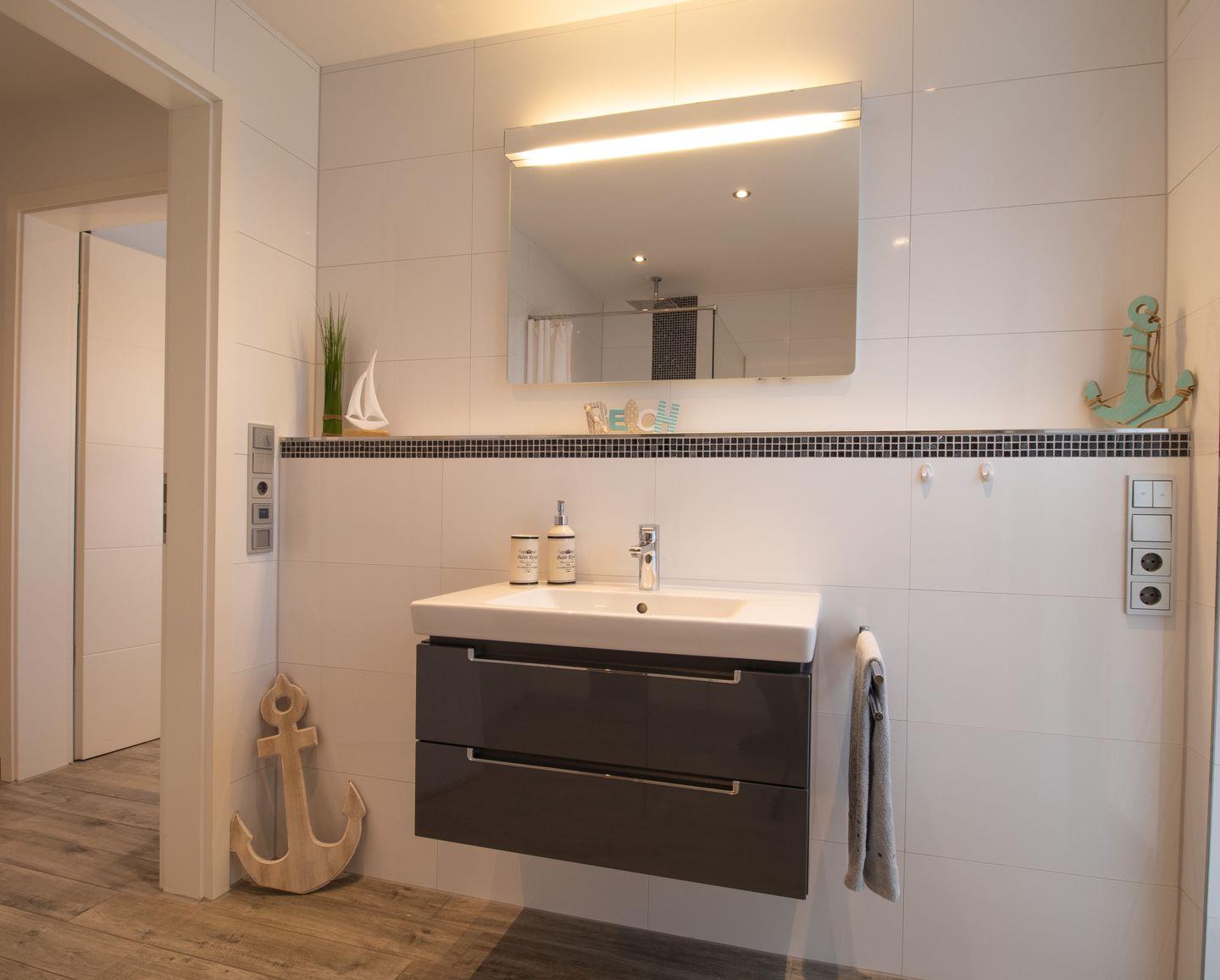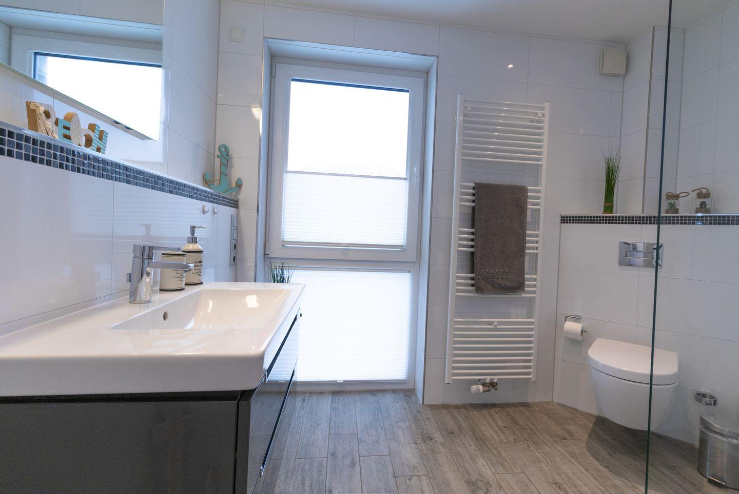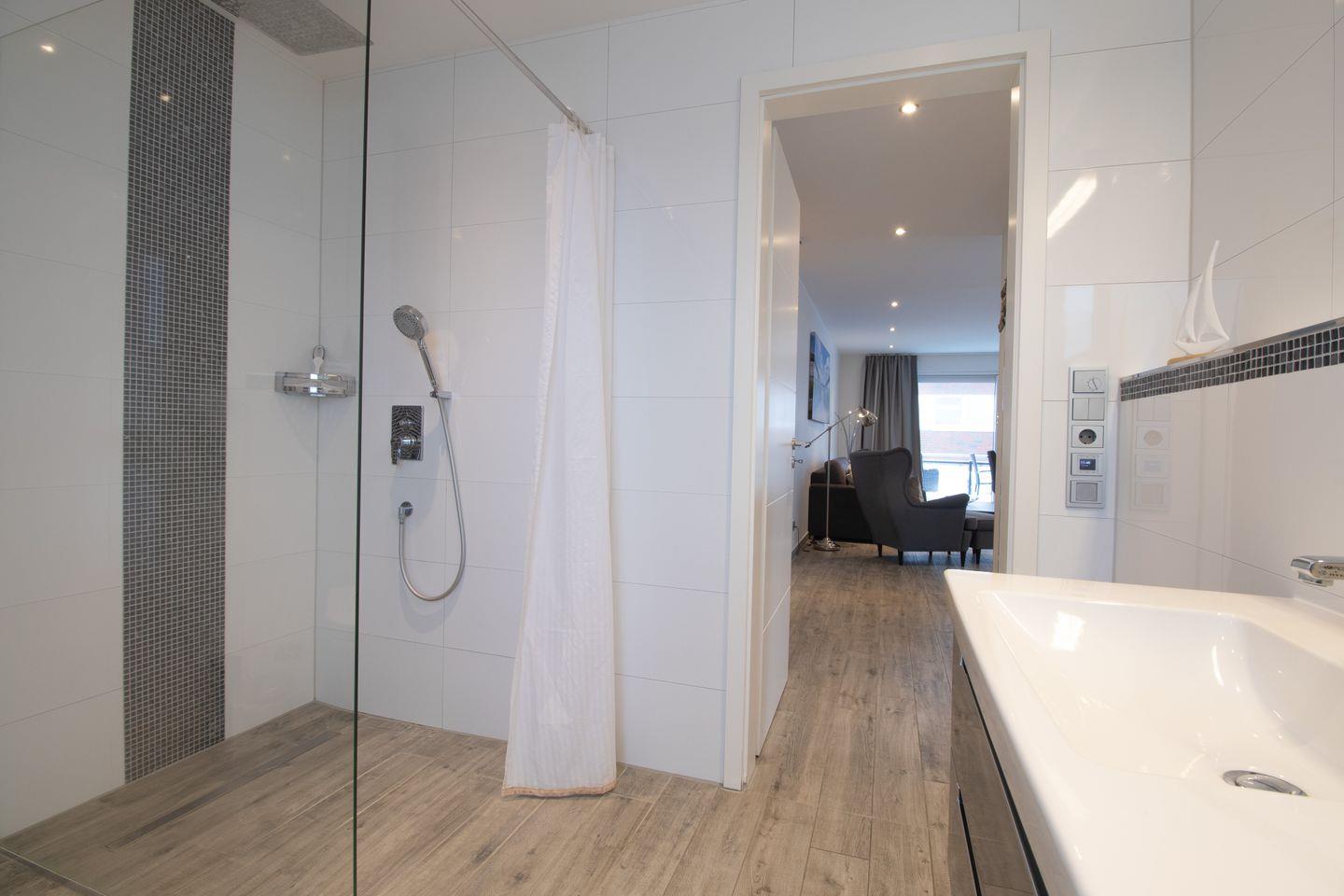 Das moderne Tageslichtbad ist mit einer bodengleichen Dusche, Waschtisch, WC und Handtuchheizung ausgestattet – dein persönlicher Wellnessbereich für die Urlaubstage.