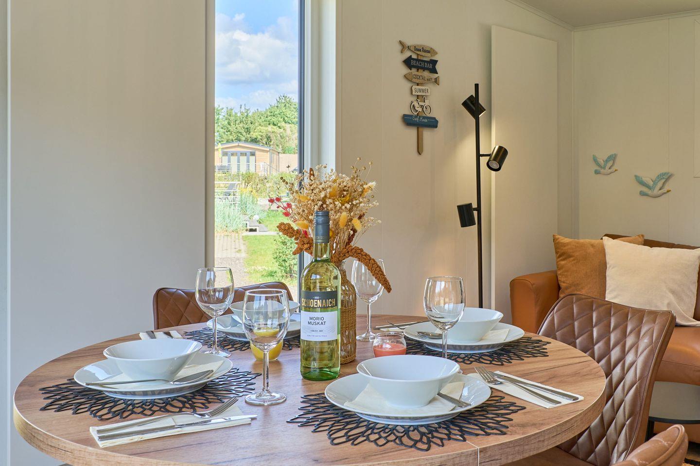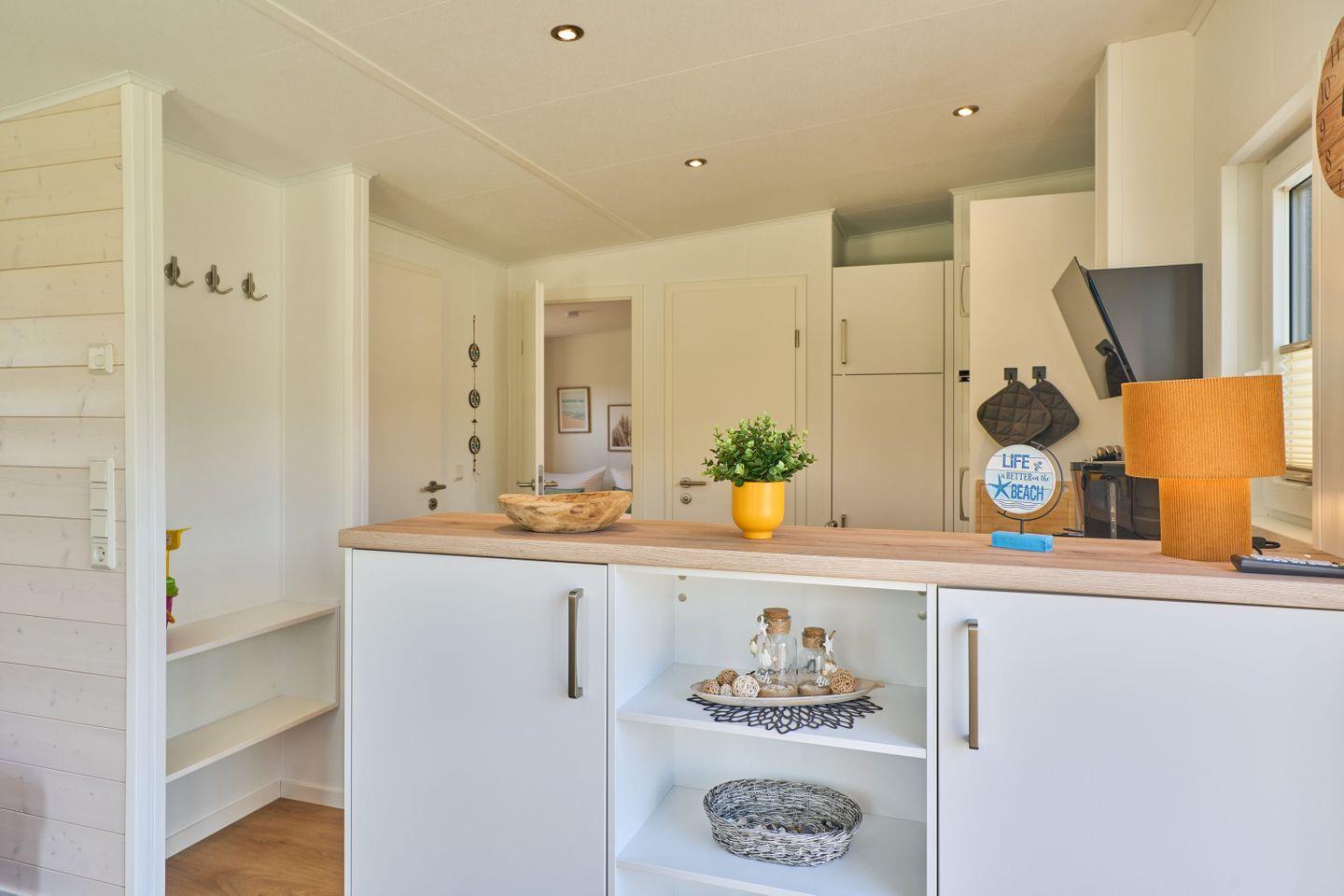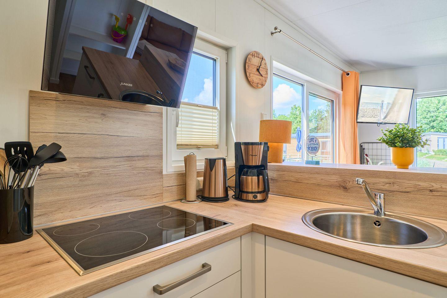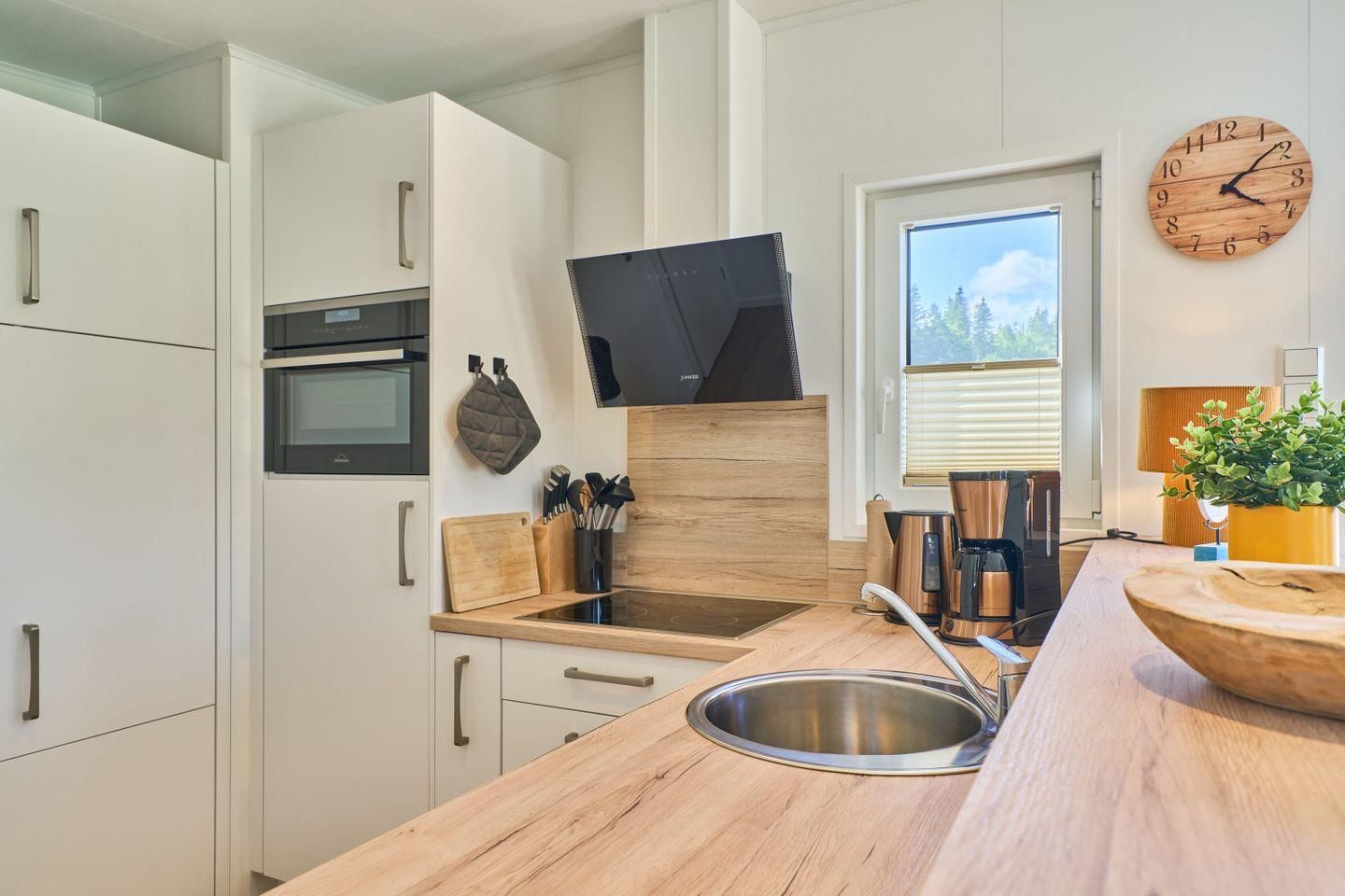 Im Inneren des Ferienhauses erwartet Sie ein offenes Wohnkonzept, das Gemütlichkeit und Funktionalität vereint. Die Ausstattung umfasst eine moderne Küche mit hochwertigen Geräten, darunter ein Herd mit Ceranfeld, ein Backofen, eine Spülmaschine sowie ein Kühlschrank mit Gefrierfach, die das Zubereiten eigener Mahlzeiten zu einem Vergnügen machen. Ein Essbereich mit Esstisch lädt ein, gemeinsame Mahlzeiten zu genießen, während das Wohnzimmer mit einem bequemen Sofa und einem Fernseher für entspannende Abende sorgt.