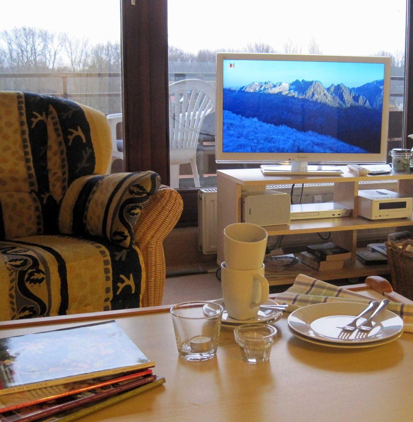Die Schrankbetten lassen sich einzeln ausklappen und stehen dann direkt nebeneinander, sodass Sie bequem schlafen. In der Küchenecke mit großem Esstisch können Sie gemeinsame Mahlzeiten genießen. Das Wohnzimmer ist ausgestattet mit einem großen Flachbild-TV, BluRay-Player und Stereoanlage mit USB- und iPod-Anschluss – für entspannte Stunden nach einem Strandtag.
