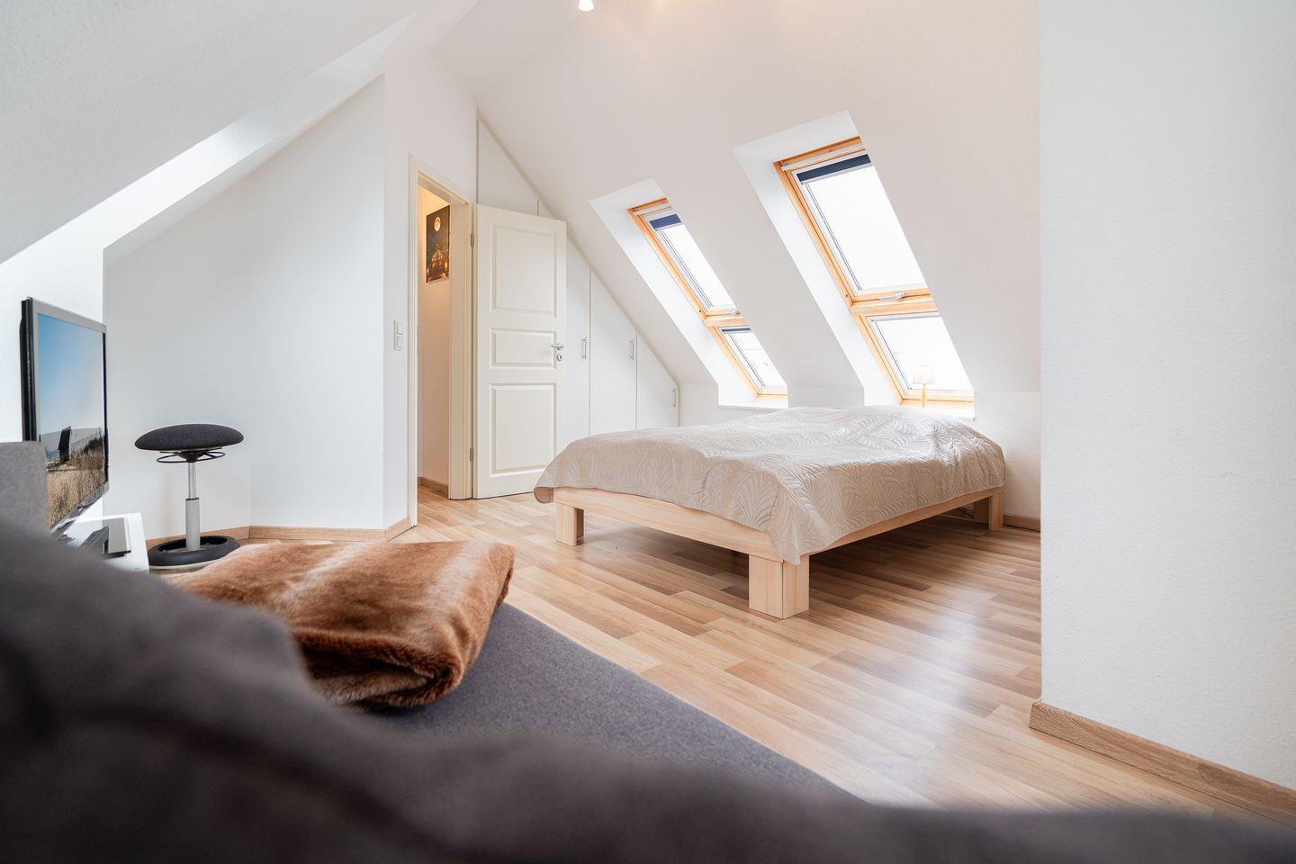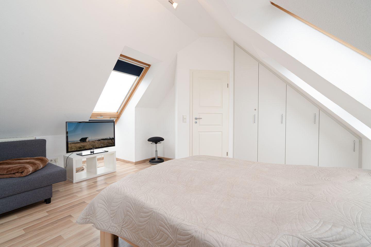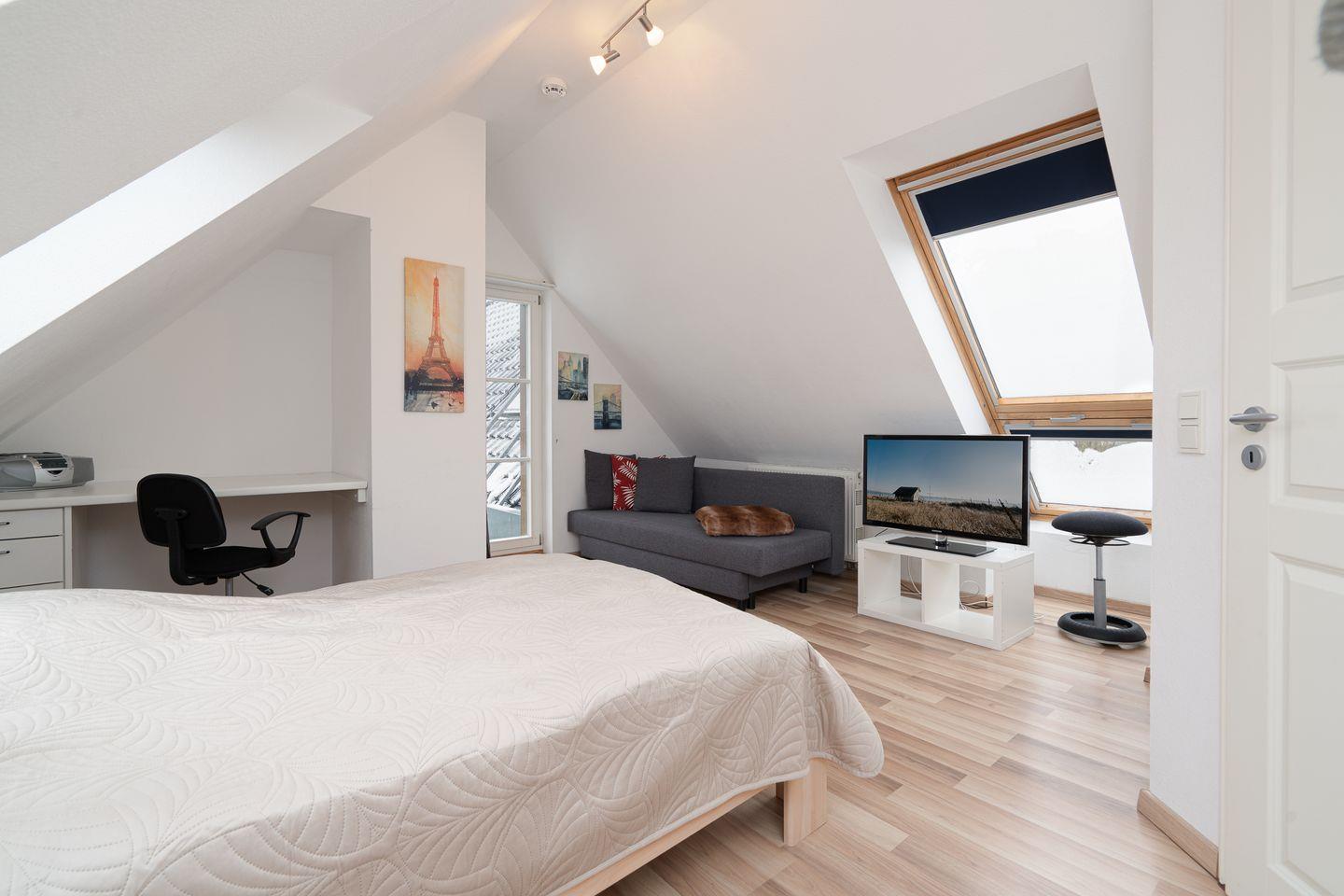 Der geräumige Wohn- und Schlafbereich in der 1. Etage verfügt über ein komfortables Doppelbett (140 x 200 cm), sowie ein Schlafsofa (130 cm x 185 cm). Auch dieser Bereich verfügt über ein TV-Gerät und einen kleinen Balkon.