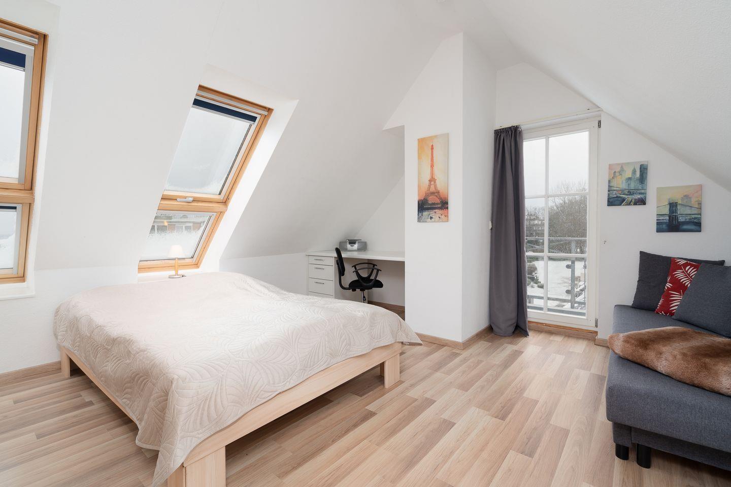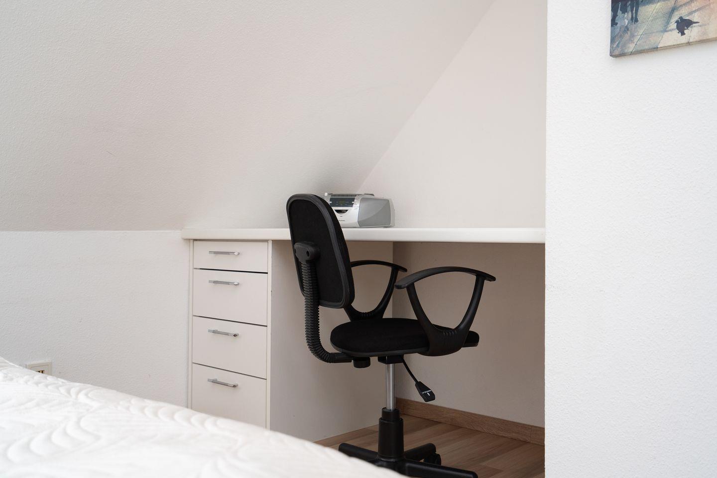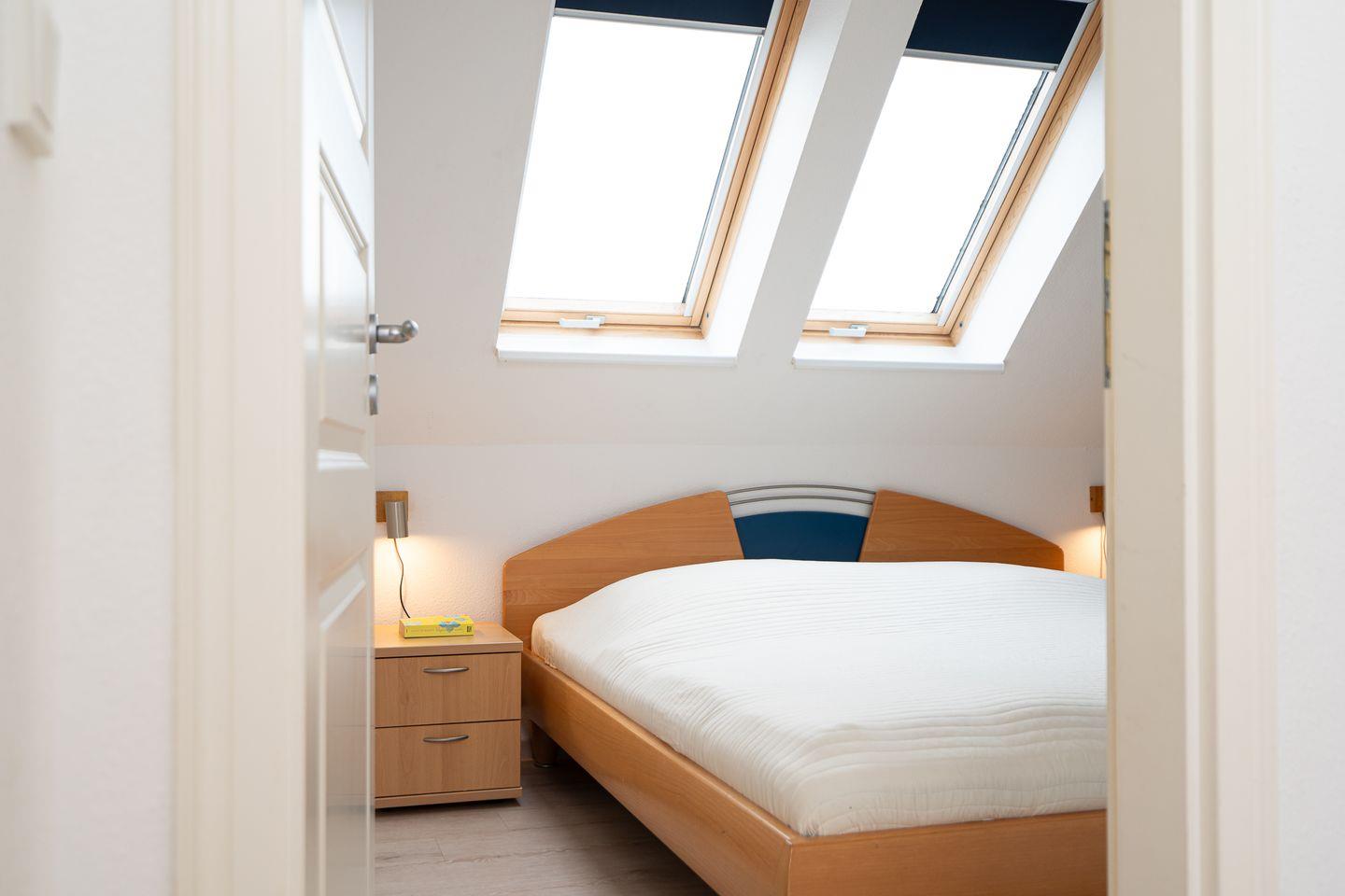 Der geräumige Wohn- und Schlafbereich in der 1. Etage verfügt über ein komfortables Doppelbett (140 x 200 cm), sowie ein Schlafsofa (130 cm x 185 cm). Auch dieser Bereich verfügt über ein TV-Gerät und einen kleinen Balkon.