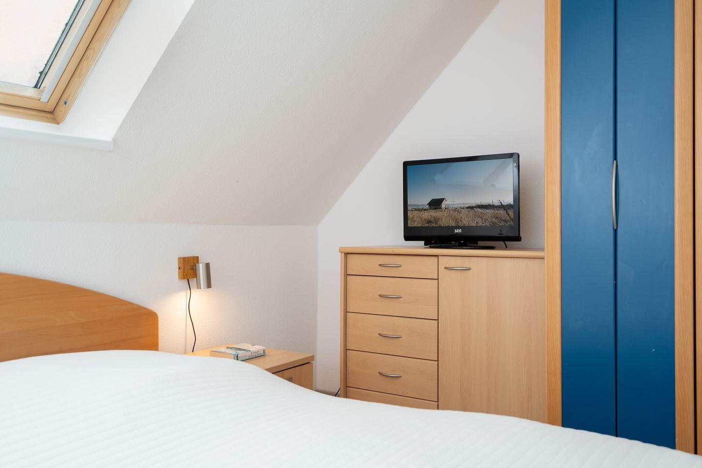Das Wohnzimmer mit TV-Gerät ist hell und einladend gestaltet und besticht durch eine gemütliche Sofaecke mit Sessel für entspannte Stunden. Der offene Wohnbereich integriert eine moderne Küche, die zum Wohnzimmer hin ausgerichtet ist. Die Ausstattung der Küche umfasst einen Ceranherd, Backofen, Mikrowelle, Kühlschrank mit Gefrierfach, Spülmaschine, Kaffeemaschine, Toaster, Küchenutensilien, sowie Geschirr und Besteck und ermöglicht komfortables Kochen – ob für kleine Snacks oder ausgedehnte Mahlzeiten. Am großzügigen Esstisch können Sie gemeinsam speisen. Das Schlafzimmer verfügt über ein bequemes Doppelbett (2x 90 cm x 200 cm), sowie ein weiteres TV-Gerät.