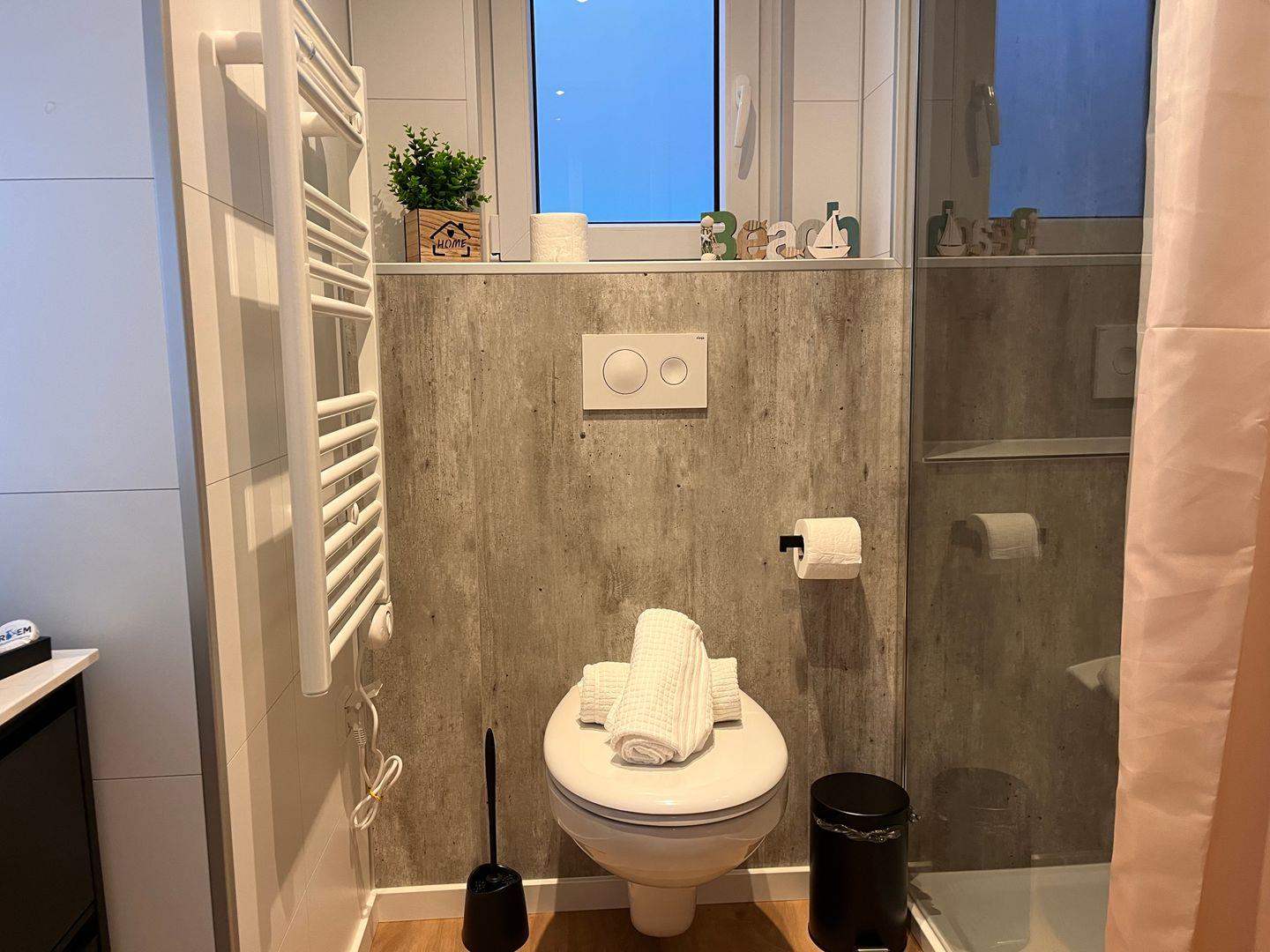 Das große, bodengleiche Duschbad wirkt modern und ist mit Haartrockner, Spiegel, Waschbecken und Fenster ausgestattet. Frische Handtücher sowie Bettwäsche gehören zur Grundausstattung, ebenso wie Geschirrhandtücher und Wäscheständer. Die Nutzung von Waschmaschine und Trockner ist gemeinschaftlich innerhalb der Ferienanlage möglich.