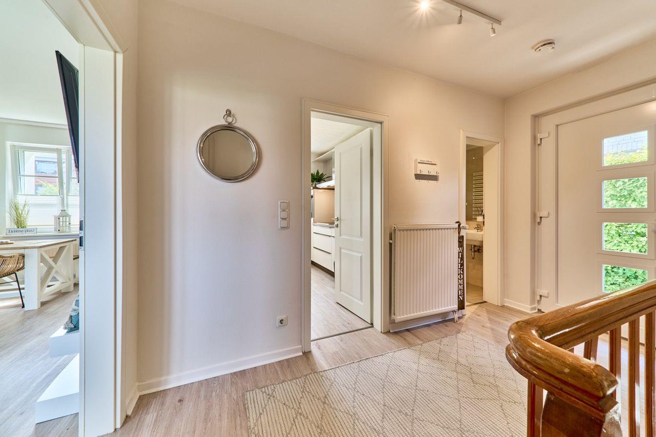 Im Obergeschoss erwarten Sie zwei gemütliche Schlafzimmer, die mit ihrer geschmackvollen Einrichtung Ruhe und Geborgenheit ausstrahlen. Das großzügige Badezimmer mit Badewanne lädt zu erholsamen Momenten ein – perfekt nach einem langen Strandspaziergang oder einem erlebnisreichen Tag an der Ostsee.