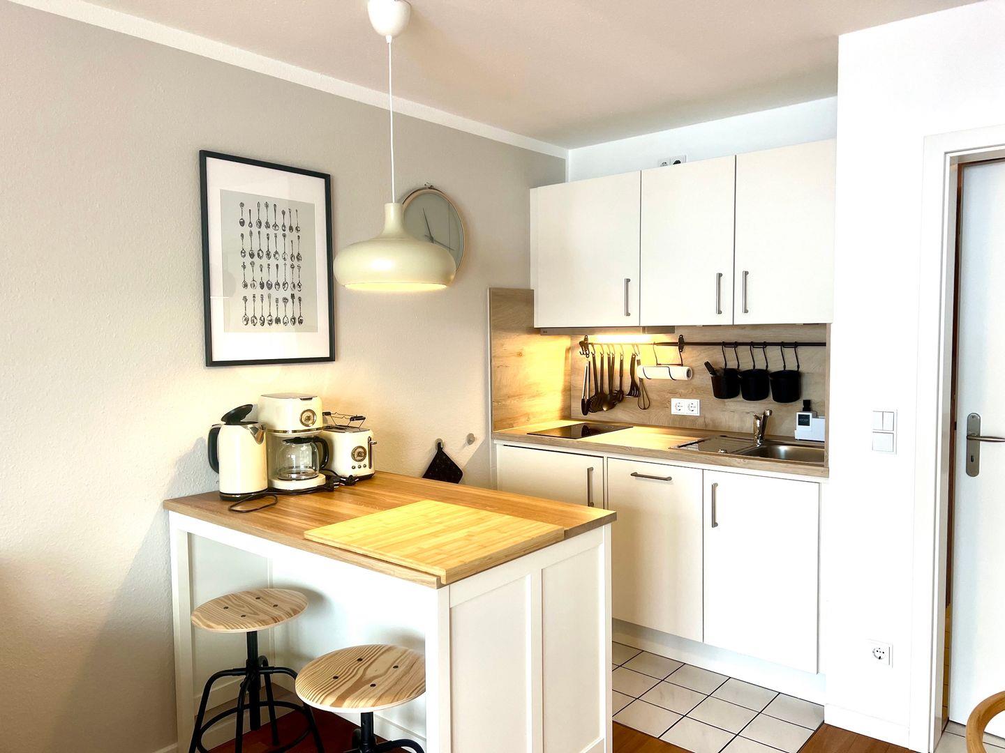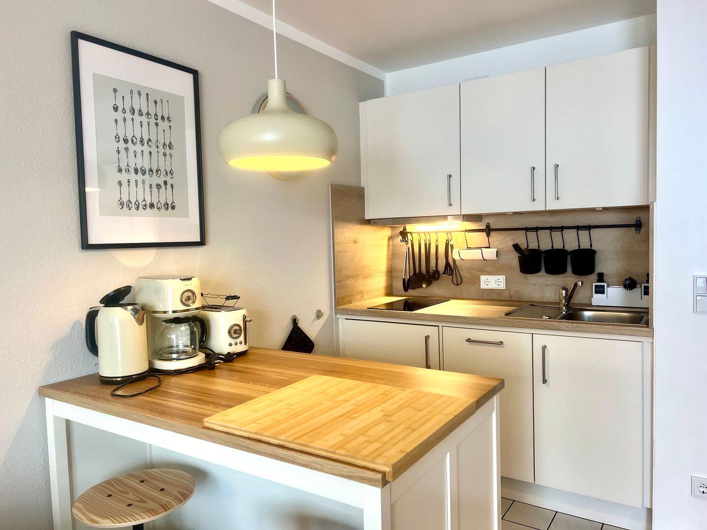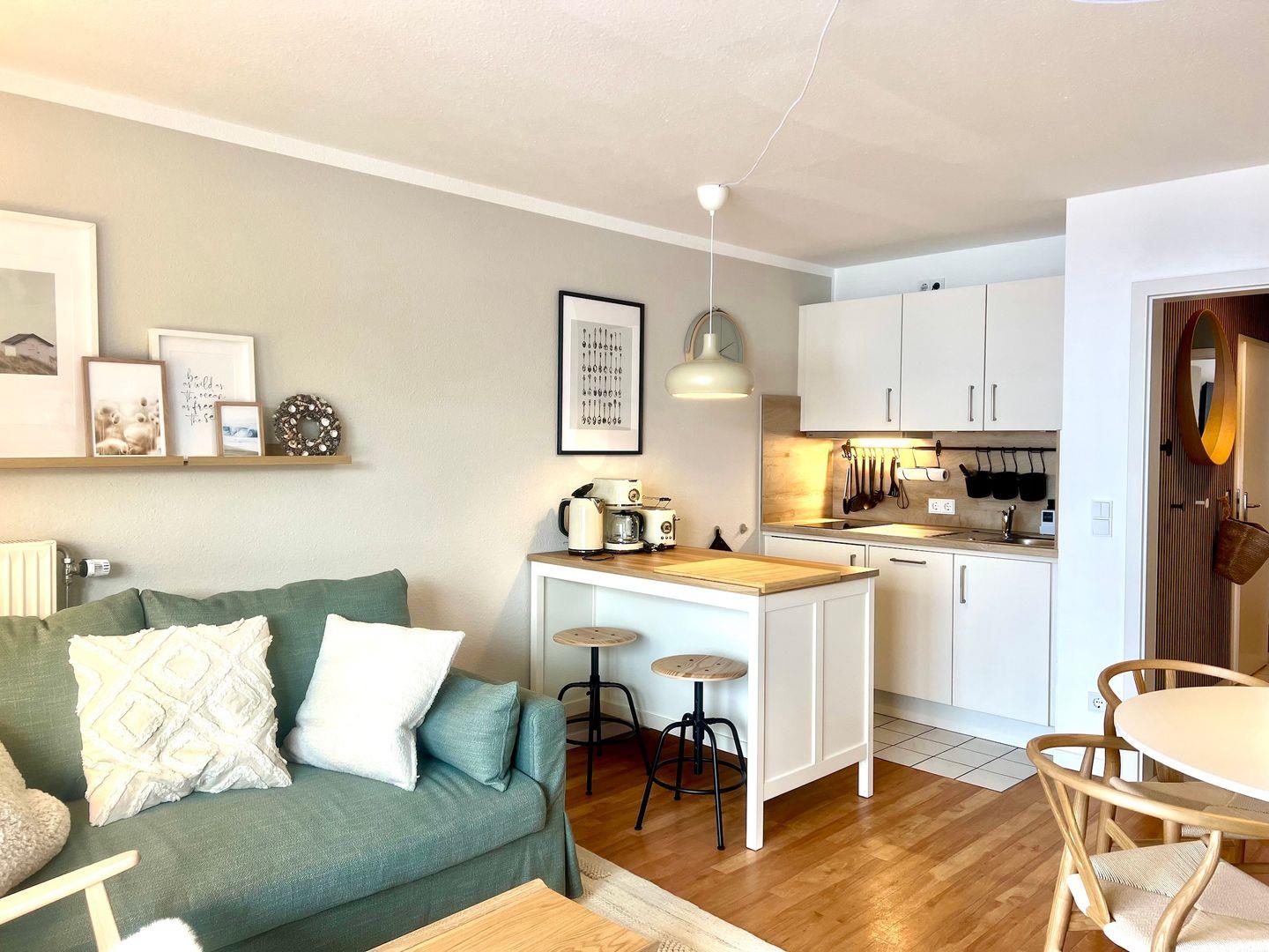 Der offene Wohnbereich mit gemütlicher Couch und rundem Esstisch lädt zum Verweilen ein. Die integrierte Küche ist mit Kaffeemaschine, Geschirrspüler und allem ausgestattet, was Sie für Frühstück oder kleine Mahlzeiten benötigen.
