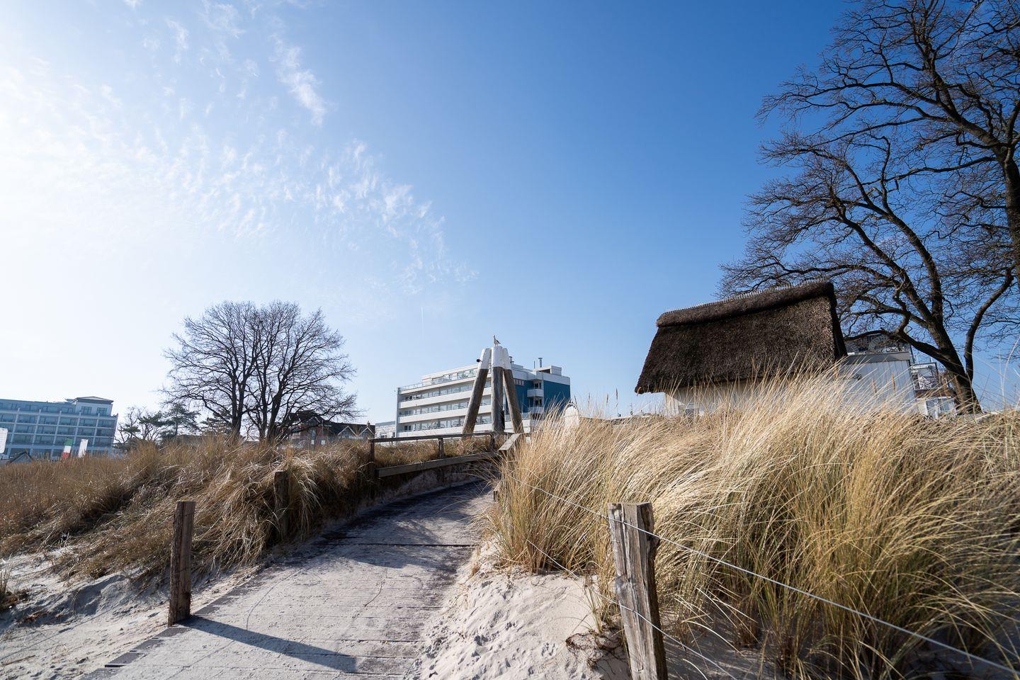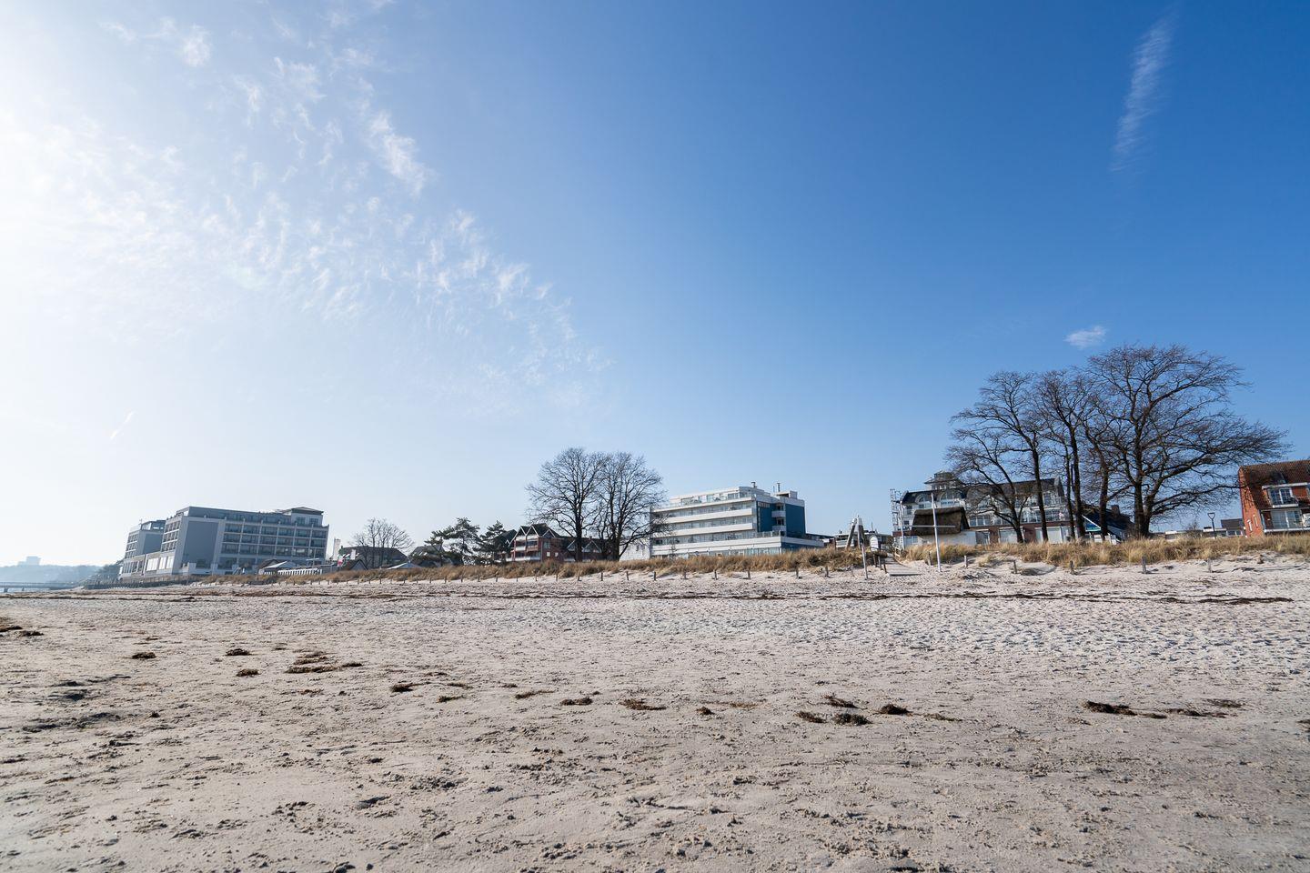 Dieses 1-Zimmer-Appartement mit direktem Meerblick liegt in erster Strandreihe in Scharbeutz und ist nur durch die Strandallee vom feinsandigen Ostseestrand getrennt. Die Ferienwohnung befindet sich im 3. Obergeschoss des Strandhotels (Strandallee 124) und ist bequem mit dem Fahrstuhl erreichbar.