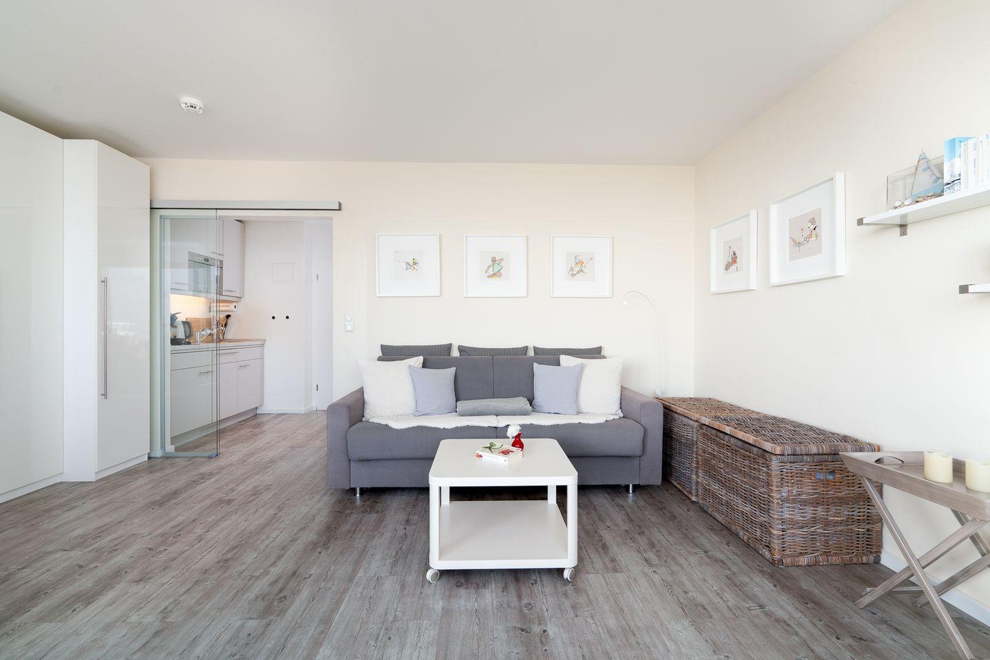 Das Apartment „Korb am Meer“ ist eine 39 m² große Nichtraucherunterkunft im 3. Stock mit Aufzug, ideal für bis zu 3 Personen. Es bietet 1 Wohn/Schlafzimmer, 1 Badezimmer mit offener Dusche, einen Balkon sowie eine offene Küche zum Wohnbereich. WLAN, TV, Waschmaschine und Trockner zur gemeinschaftlichen Nutzung sind vorhanden. In erster Strandreihe gelegen, mit außergewöhnlich gutem Meer- und Strandblick, nur 40 m zum Meer und 20 m zum Strand.