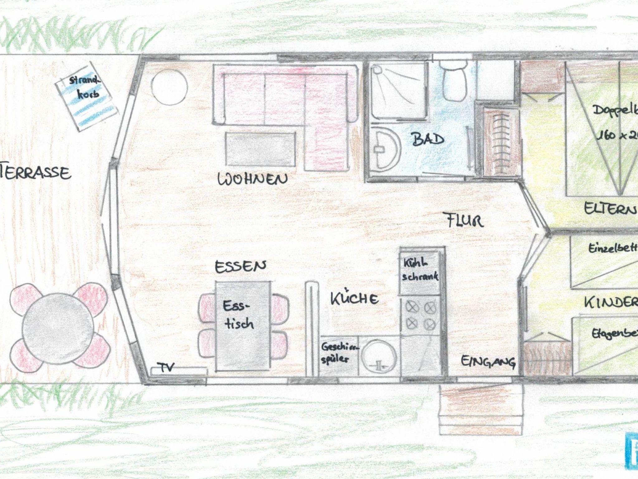 - Bad: Dusche, Waschbecken, Spiegel, WC Terrasse: teilweise Teilüberdachung, Gartenmöbel, Strandkorb. Kein Sonnenschirm vorhanden!