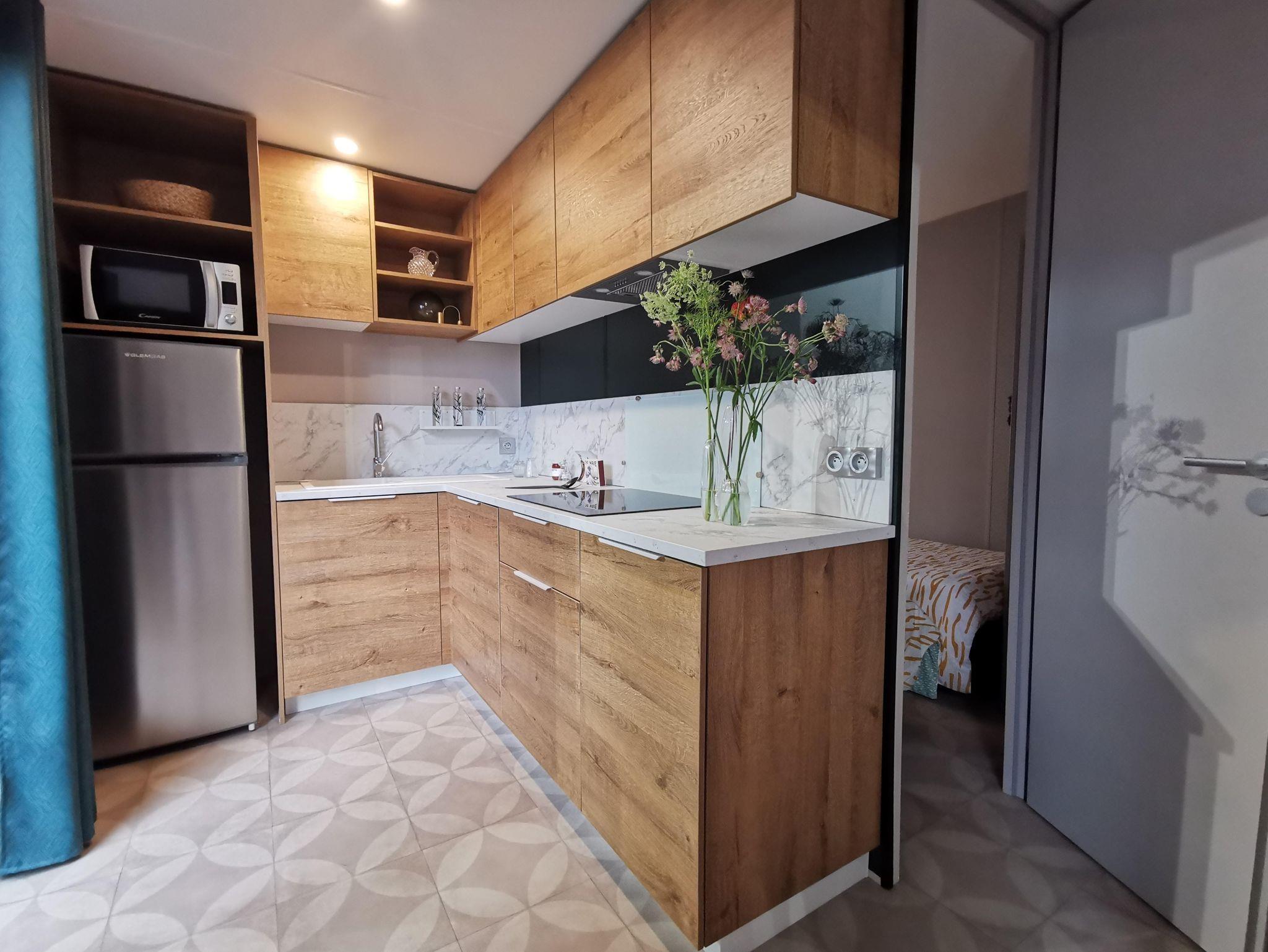 - Wohnzimmer: Esstisch, Sofaecke, TV Küche: großer Kühlschrank mit Gefrierfach, Mikrowelle, Toaster, Wasserkocher, Filterkaffeemaschine, Ess-/Kochgeschirr