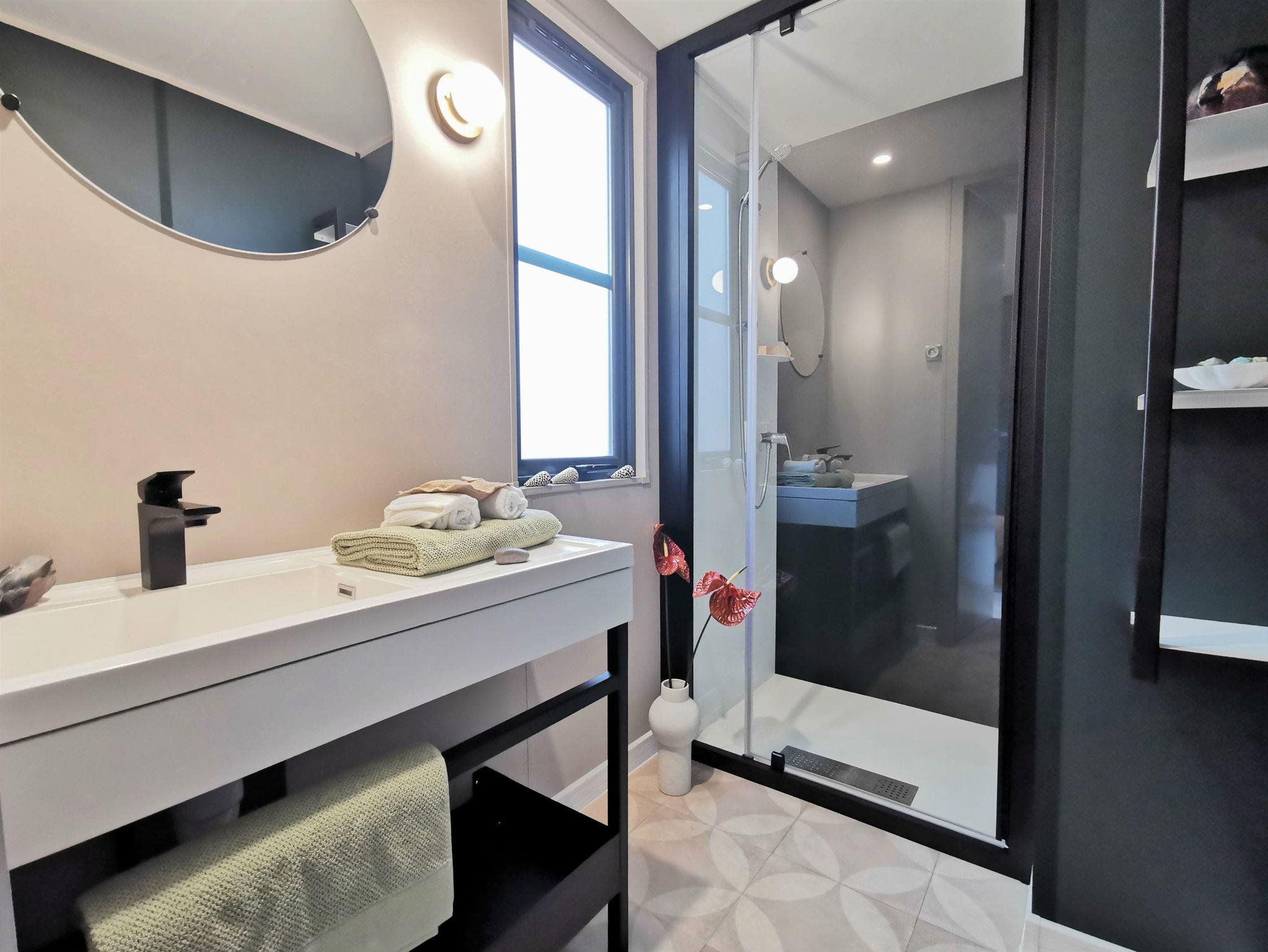 - Bad: Dusche, Waschtisch, Spiegel, separates WC