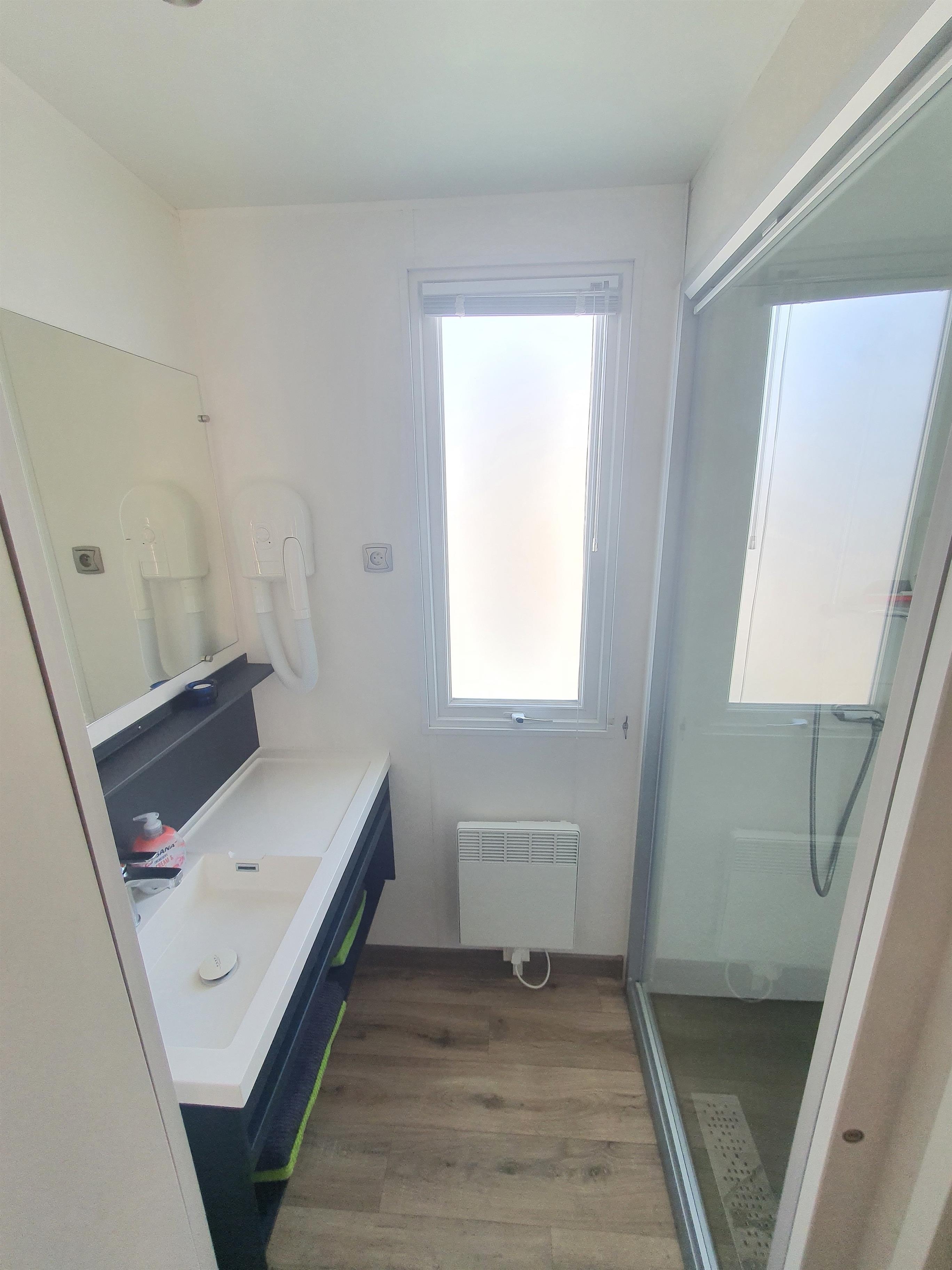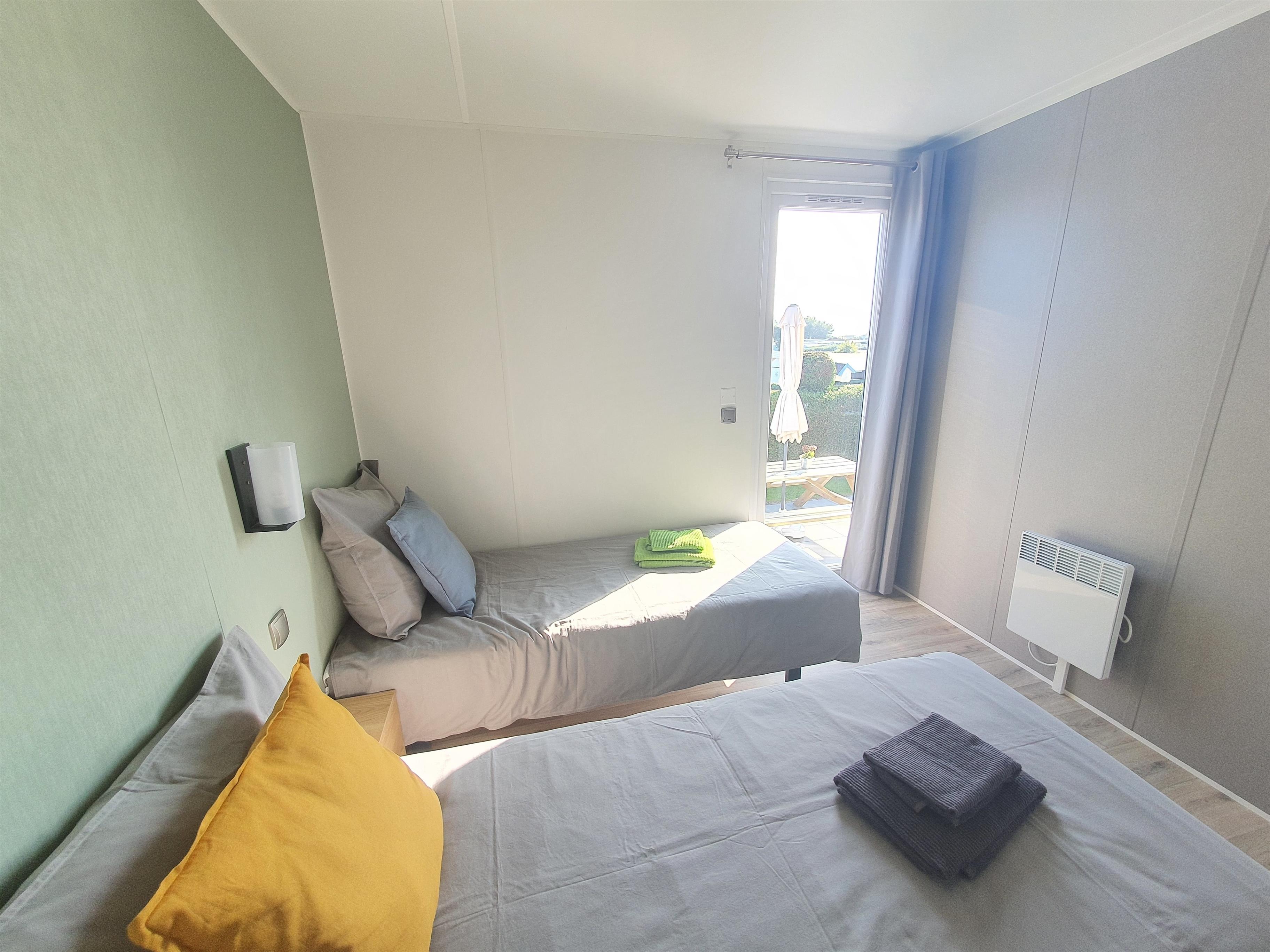 Unsere Mobilheime sind hell und modern ausgestattet und verfügen jeweils über einen kombinierten Wohn-/Essbereich mit integrierter Küchenzeile, 2-3 Schlafzimmern, 1-2 Bädern mit Dusche sowie 1-2 separaten WC. Eines der Bäder ist jeweils direkt von einem der Schlafzimmer aus zugänglich (en-suite). Auf der Terrasse stehen Ihnen ein eigener Strandkorb, ein Tisch mit Bänken und Sonnenschirm sowie ein Grill zur Verfügung. Ein kleiner Gartenbereich sorgt für weitere Entspannungsmöglichkeiten. Ihr Auto parken Sie direkt am Mobilheim.